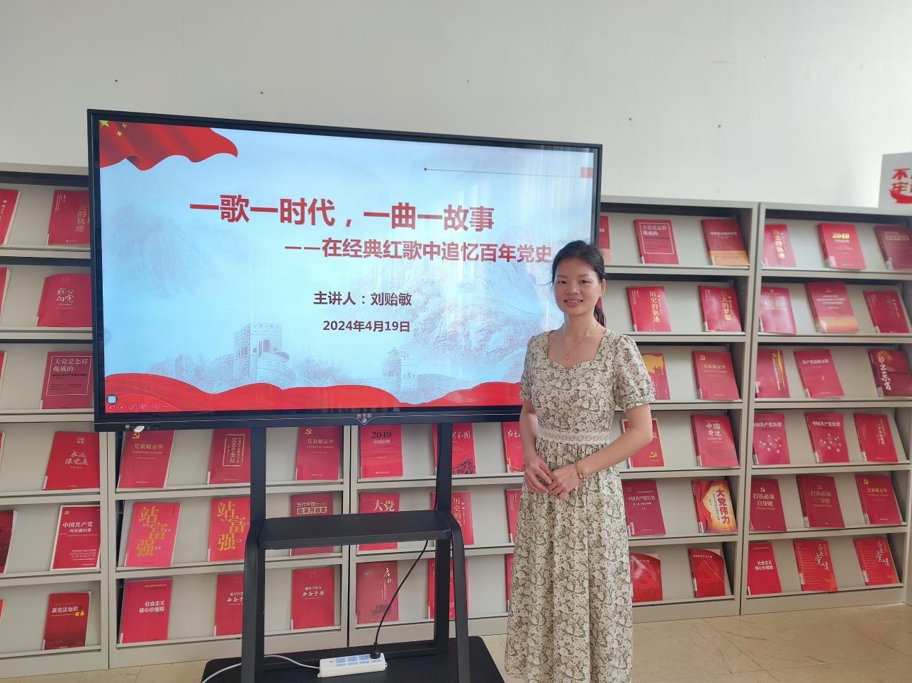 4月19日下午5:00,刘贻敏老师在图书馆三楼“红色阅读角”举办红色知识专题讲座,本期讲座的主题是一歌一时代,一曲一故事——在经典红歌中追忆百年党史。(张新玲摄)