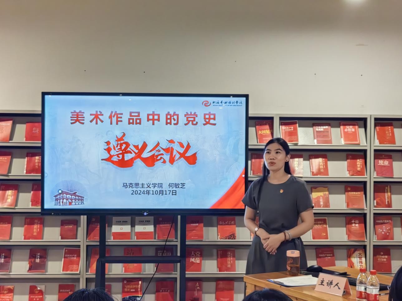 10月17日19:30,何敏芝老师在图书馆三楼“红色阅读角”举办红色知识专题讲座,本期讲座的主题是美术作品中的党史。(张家梅摄)
