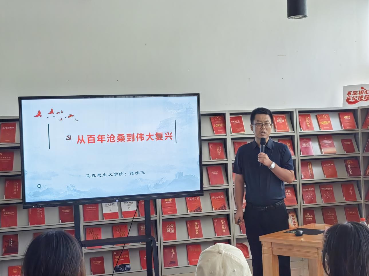 10月22日下午4:00,张宇飞老师在图书馆三楼“红色阅读角”举办红色知识专题讲座,本期讲座的主题是从百年沧桑到伟大复兴。我校建筑与环境艺术设计学院积极分子到场聆听讲座并参与互动,氛围良好,同学们纷纷表示受益匪浅。(张家梅摄)