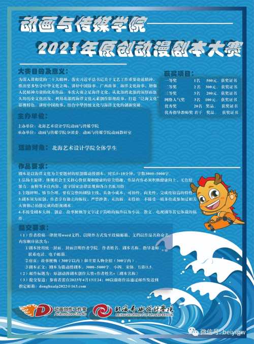 为深入贯彻党的二十大精神,落实习近平总书记关于文艺工作重要论述精神,推出更多坚守中华文化立场,讲好中国故事、广西故事、海洋文化故事,增强人民精神力量的优秀作品。同时,通过“以赛促教,以赛促学、以赛促改、以赛促建”的模式,训练学生创新、创意的思维能力,推动艺术教学教育的改革与发展,激发广大学生对艺术创作的热爱。现决定举办2023年原创动漫剧本大赛。