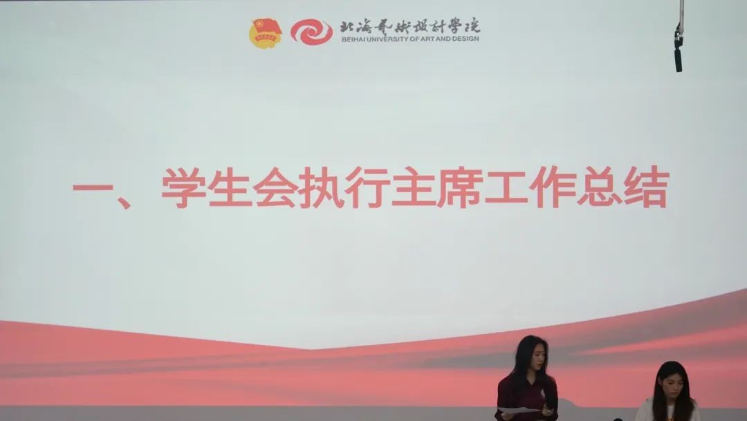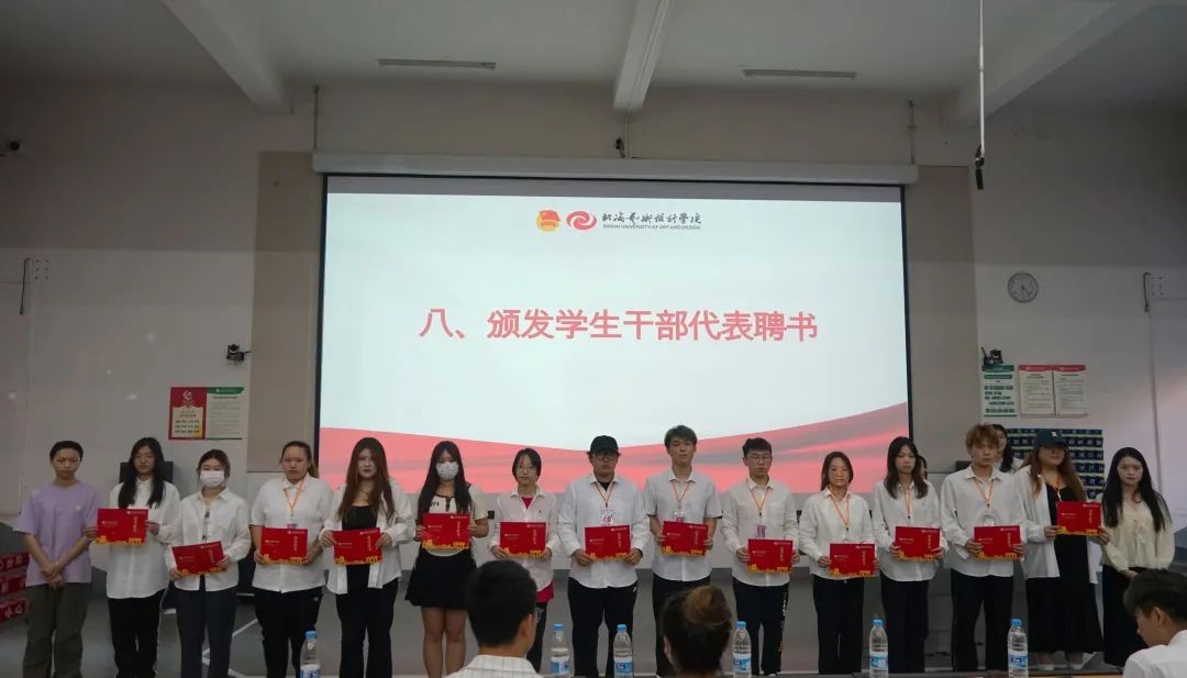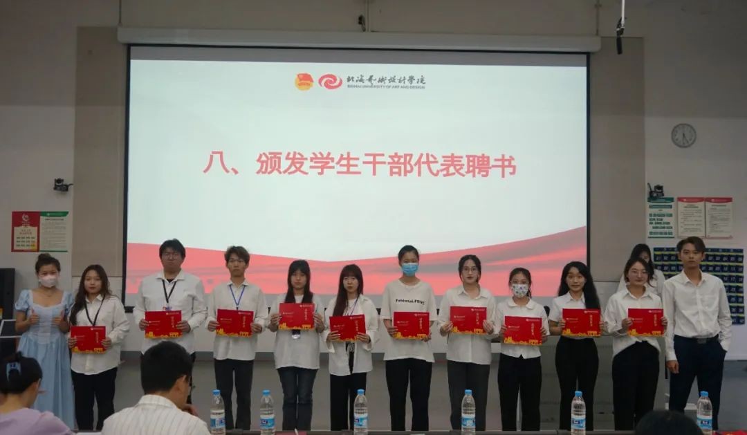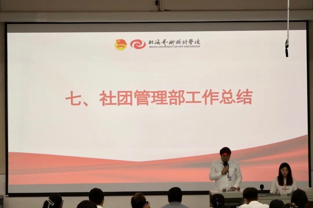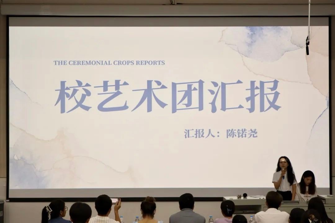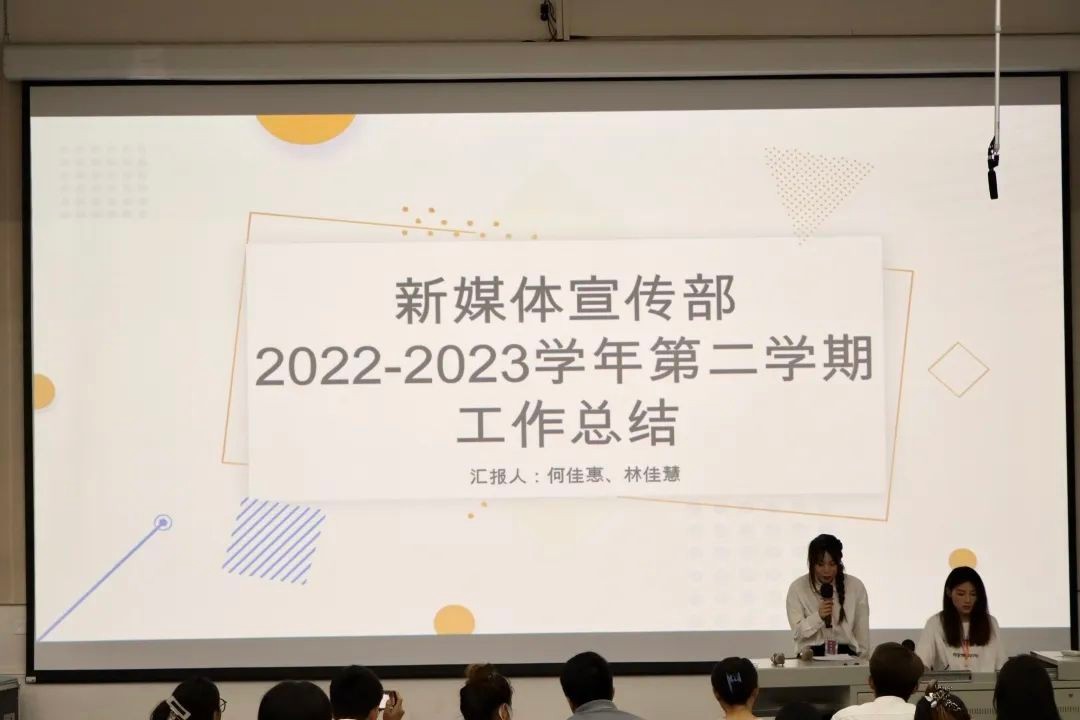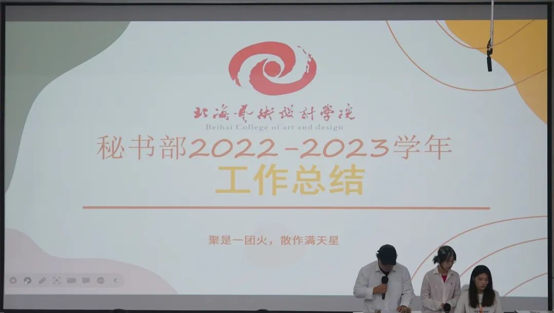 出席本次大会的领导老师有团委书记唐良春、团委办公室主任曹永攀、团委组织部部长陈文斌、社团管理部部长杨美琪、新宣部指导老师林修竹、艺术团指导老师陈万奇、张启源、团委老师王燕亭。 本次大会共分为三项议程 大会第一项议程:各学生组织做工作总结。 一、校学生会 学生会执行主席团成员代表学生会各个部门做工作总结以及工作计划。她列举出各个部门这一年来所开展的活动,对收获的工作成效给予了充分的肯定,同时也根据各部门所存在的问题提出了相应的改进意见。表示在未来的工作中,学生会将继续团结协作,用心投入到工作中,并且会做好充足准备,迎接九月份迎新志愿者活动。 二、校团委秘书部 秘书部负责人首先展示了往期工作,其次汇报了整体工作总结,罗列出部门存在的问题以及解决方式,最后提出未来展望,他们表示会保持初心,坚持严谨认真的工作态度,做到大事不误、小事不漏,以实干促成效,同时会加强秘书部作为中枢部门的纽带作用,积极配合各个方面的工作。 三、校团委组织部 组织部负责人表示,在过去的三个多月里,在校团委老师指导带领下,各项工作有序进行且出色完成。在新学期里,会继续保持不忘初心,秉持上学期优秀经验,同时谋求创新,不断总结经验,积极反思。 四、校团委青年志愿者协会 青志协负责人先解读了往日的工作,然后提出未来工作计划以及四点改进方案: 1、协会成员的自身建设。2、丰富活动内容。3、改革创新活动形式。4、对待问题早发现早解决。 五、校团委新媒体宣传部 新媒体宣传部负责人首先对部门工作情况进行了总结,接着对本学期制作的海报、幕布和推送的文章进行了展示。最后,提出了工作展望,表示在接下来工作中会勇于创新,提高工作效率,加强各部门之间的联系。 六、校艺术团 艺术团负责人归纳总结了本学期的进步以及不足之处,并且制定了下学期工作计划,希望能保持对团的热爱,延续团内和谐的氛围,出现问题及时沟通,坚持对训练和活动的积极性。 七、社团管理部 社管部负责人对工作进行回顾总结,接着提出未来工作计划,表明未来要贯彻对工作高度负责的精神,脚踏实地,尽职尽责的做好每一份工作。 大会第二项议程:颁发学生干部代表聘书。 大会第三项议程:校团委书记总结讲话。 最后,由团委书记唐良春总结讲话。首先他对学生组织本学期开学以来的努力工作表示肯定与赞赏。其次,他也提出了工作汇报存在的问题,最后,他希望各学生代表能够勇于表达自己,汇报时能够展现自己部门特色,同时不断突破自我,让每一位学生代表都能成为北艺的闪光点。 至此,2022-2023学年第二学期校团委期末总结大会顺利结束。在新学期的工作中,学生会全体成员将继续践行全心全意为同学服务的宗旨,以踔厉奋发、笃行不怠的昂扬风貌迎接新的挑战,以焕然一新的面貌取得更加辉煌的成就。(瞿晶晶、丁泓尹/摄)