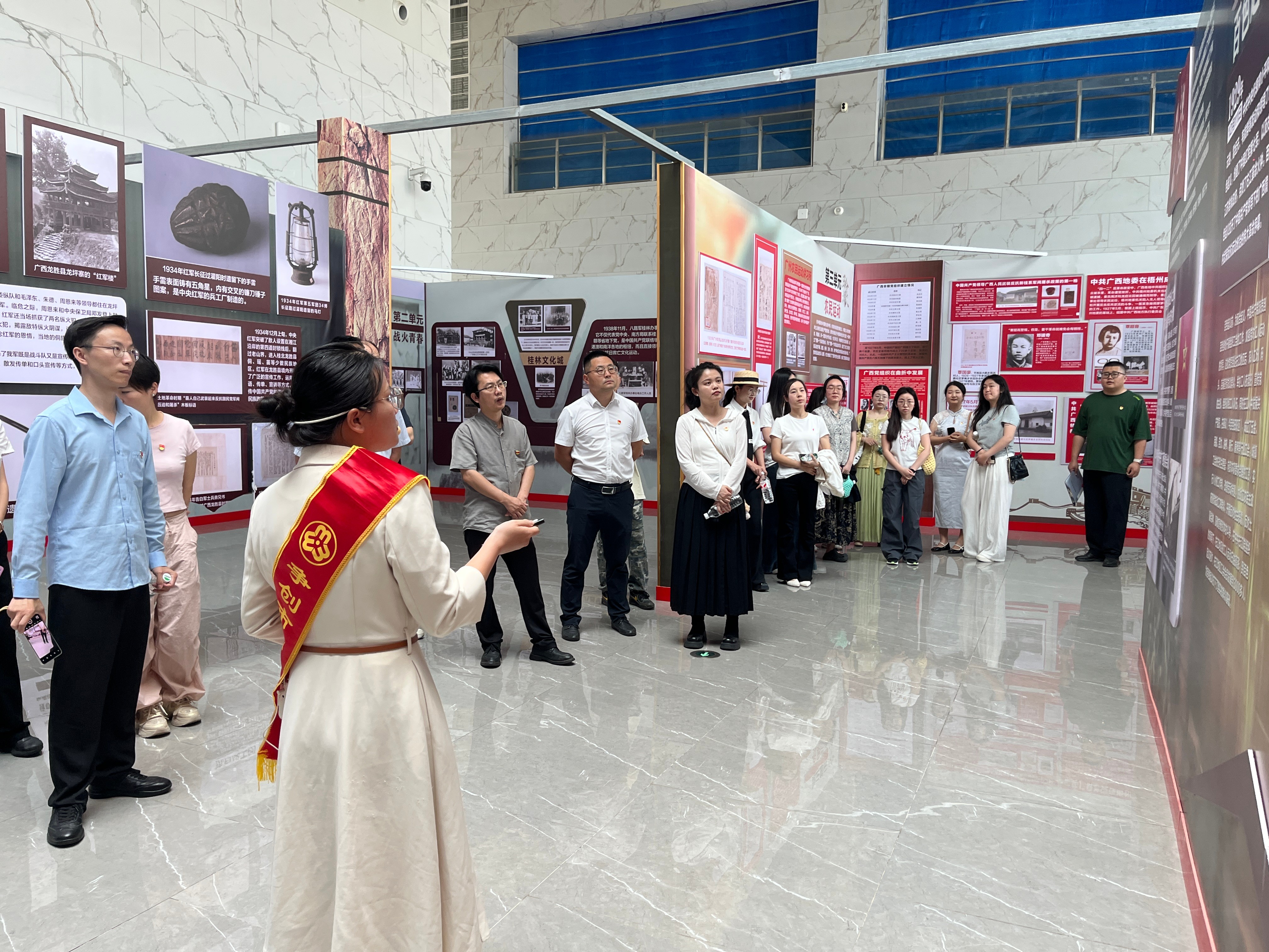 展览设“革命播火”“土地革命”“抗日救亡”“赢取胜利”四个篇章,系统呈现了中国共产党带领八桂儿女的奋斗历程。师生党员在一张张图片前驻足观看,从广西第一个党支部的成立到湘江战役的血火淬炼,再到红旗插上镇南关,革命先辈的英勇事迹令人印象深刻。随着讲解员的生动讲解,大家对广西革命历程有了更深理解,历史图片与文字史料让党史知识变得可感可触。
