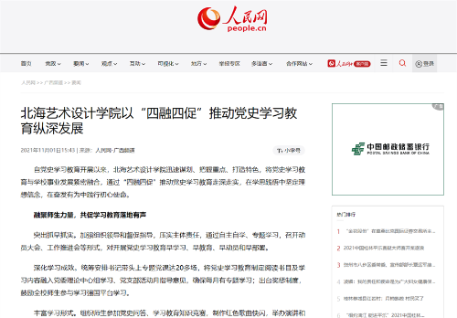 11月1日,人民网以《北海艺术设计学院以“四融四促”推动党史学习教育纵深发展》为题,报道我校通过“四融四促”推动党史学习教育走深走实。自党史学习教育开展以来,我校谋划重点,打造特色,将党史学习教育与学校事业融合发展,成效显著。
