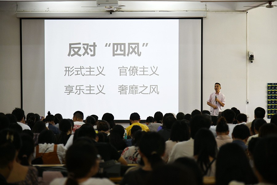 黄锦书记首先向大家介绍:习近平总书记在二十届中央纪委二次全会上强调,制定实施中央八项规定是我们党在新时代的徙木立信之举,必须常抓不懈、久久为功,直至真正化风成俗,以优良党风引领社风民风。并要求大家将中央八项规定精神落实到自己所担任的教育教学具体工作中去,随后带领大家学习中央八项规定精神的具体内容,并通报了我院“四风”问题自查自纠的排查情况。