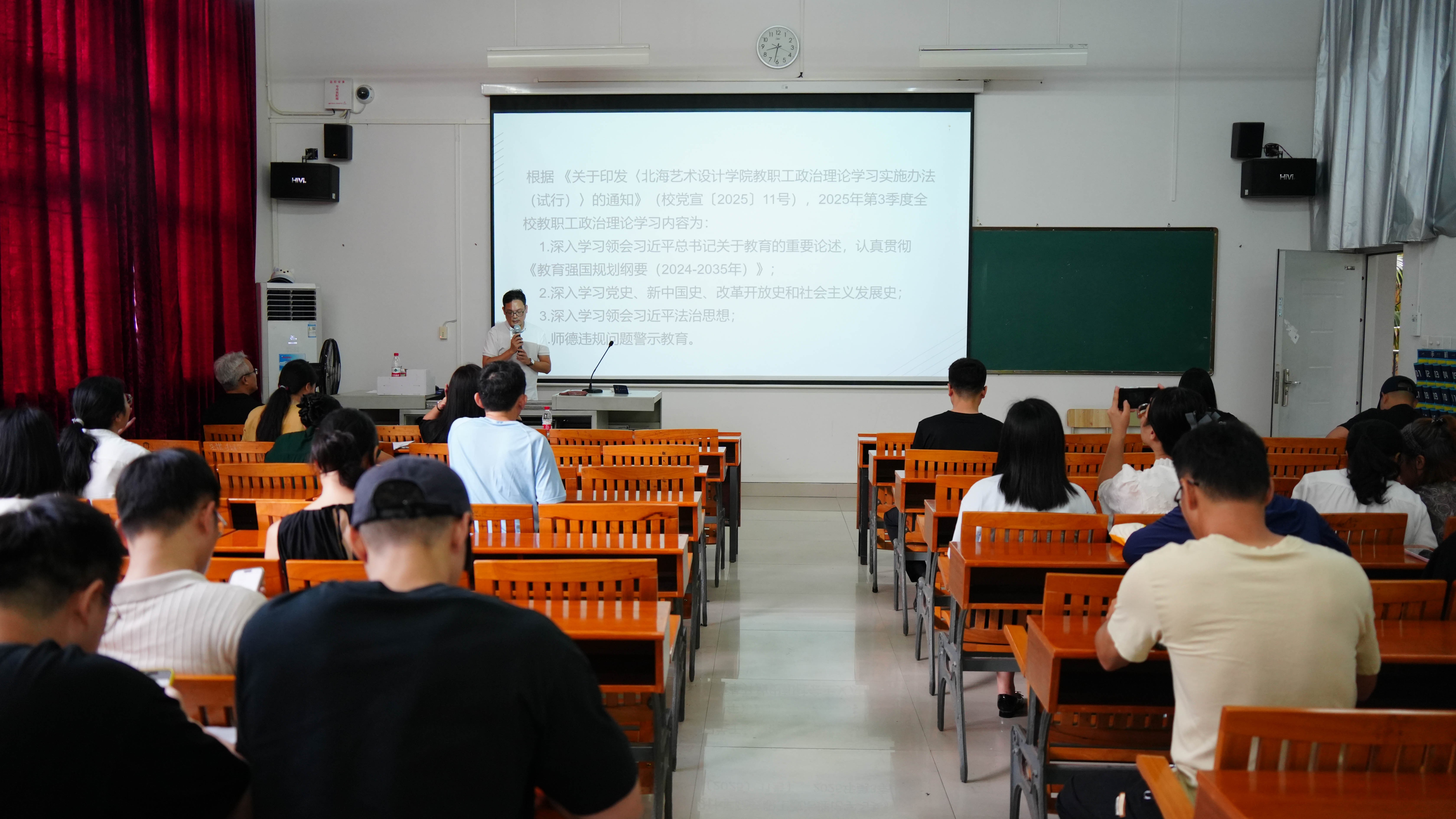 2025年10月15日上午,建筑与环境艺术学院在公德楼106教室组织开展2025年第三季度政治理论学习活动。此次学习由我院庞定坤书记带领全体教职工进行,旨在通过系统理论学习,进一步统一思想、凝聚共识,为教育教学工作注入思想动力。