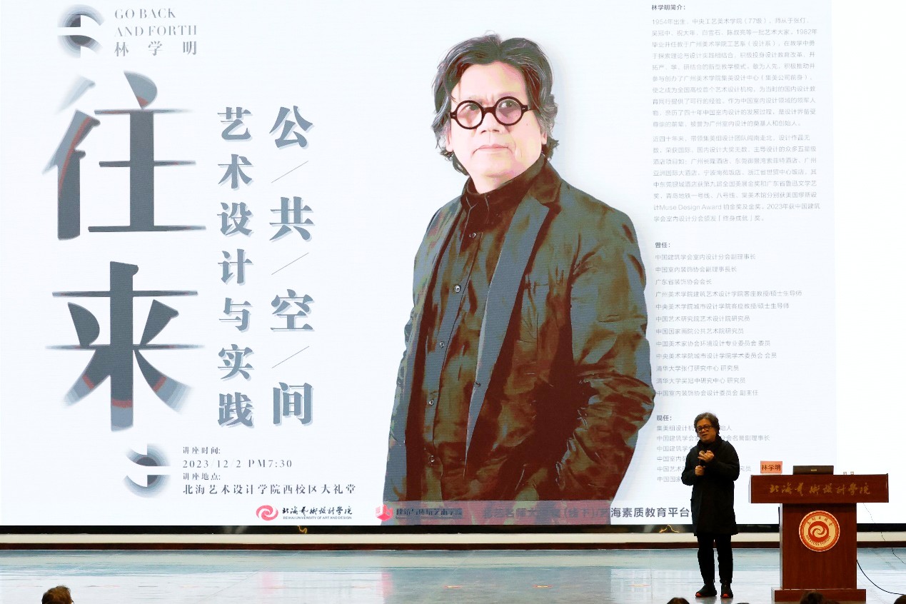 艺术是生活的舞动,设计是艺术的表现。2023年12月2日,我院于西校区大礼堂开展了《“往来”公共空间艺术设计与实践》主题讲座。本次讲座诚挚邀请到中国建筑学会室内设计分会名誉副理事长、中央美术学院城市设计学院硕士生导师林学明主讲。