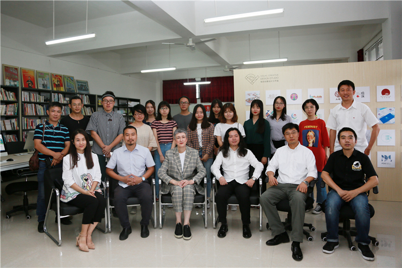 之后,副校长胡胜及Jane Stanton教授一行人参观了视觉传达工作室,Jane Stanton教授对我校师生作品及所取得的成果给予了极高的评价,并与各工作室师生亲切交谈,合照留影。