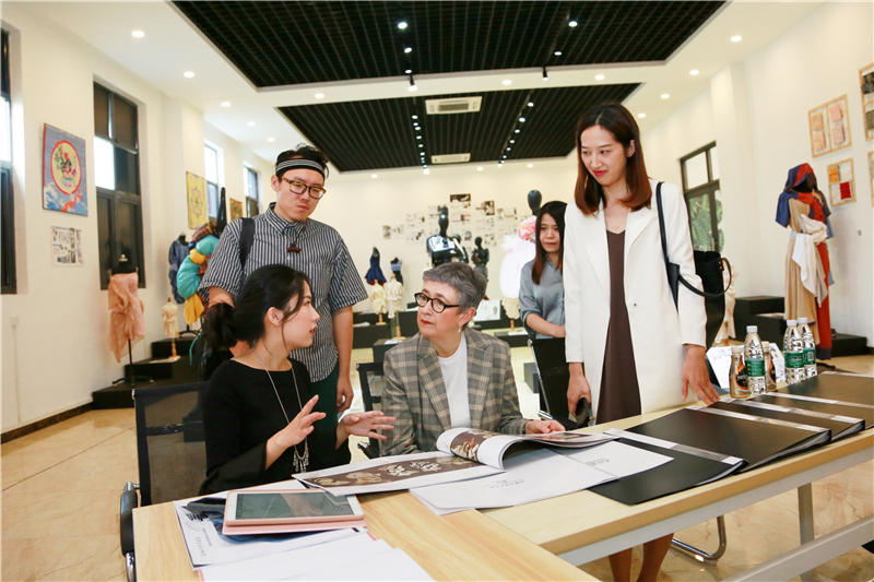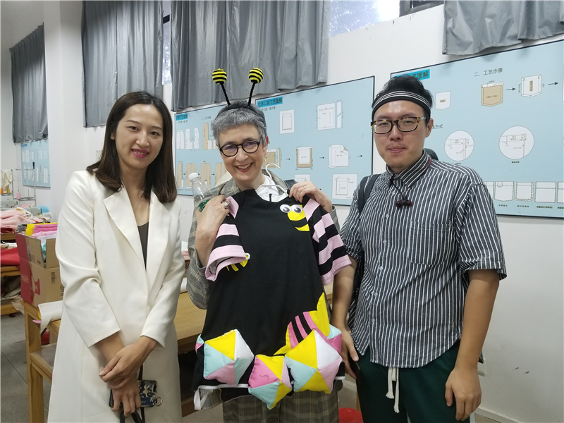 在参观我校服装学院工作室时,Jane Stanton教授认真听取了陈婷婷老师对于服装学院的相关介绍,并参观了服装学院师生的作品,当参观到服装学院实训室时,Jane Stanton教授对同学们设计创作的童装作品充满兴趣,赞不绝口。