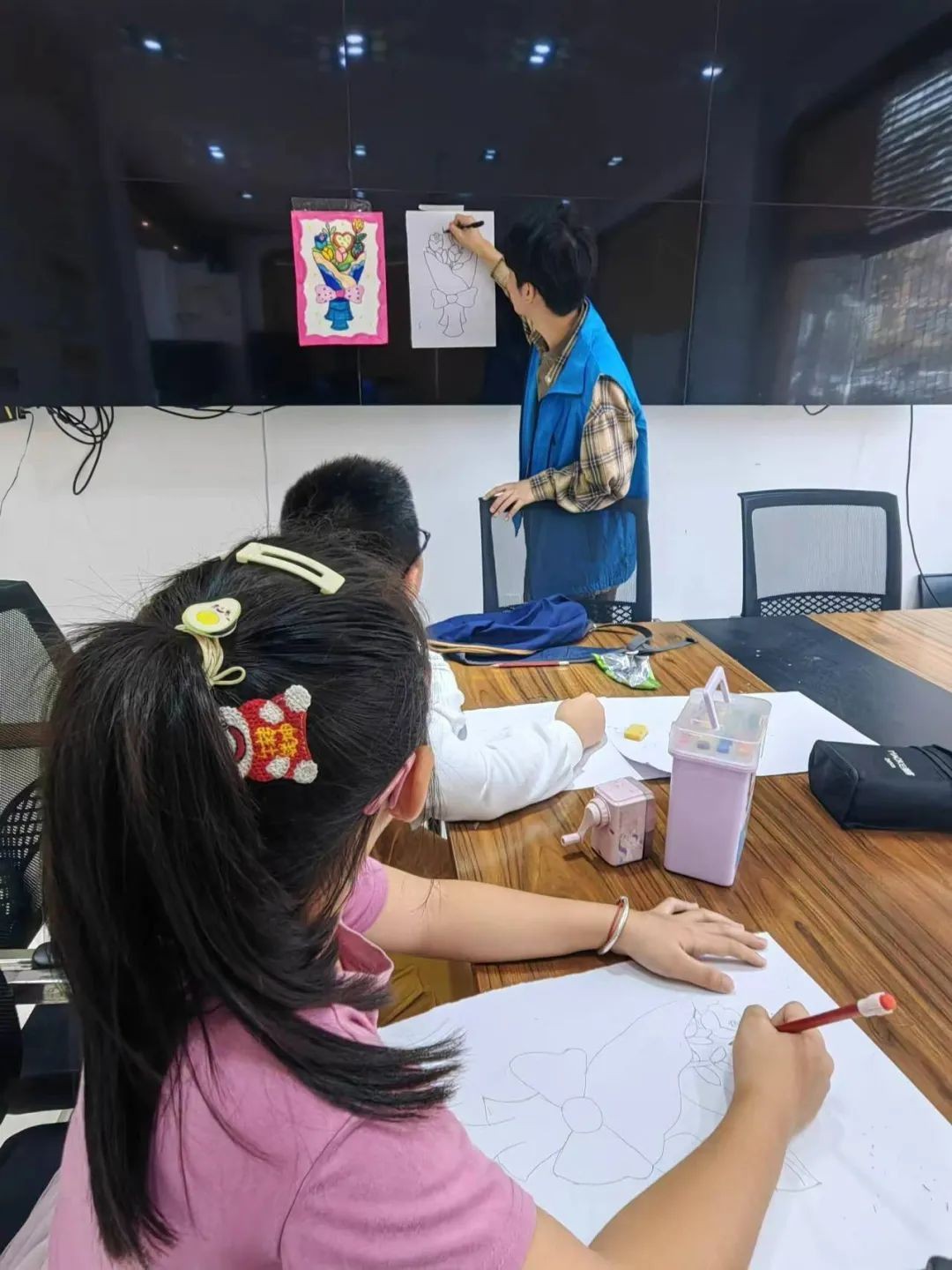 走入课堂,出色的志愿者们有效的将自己熟练掌握的专业知识传授给社区的孩子们,他们用彩色笔勾勒出每个孩子心中的理想,用铅笔教会孩子们用画表达自己的所思所想,不仅有绘画,还有手工制作,让孩子们用手的同时也保持头脑的灵活。志愿者们用画笔在黑板上绘着小朋友充满希望的未来、用巧手在课桌上折出多样的世界,孩子们纯真的笑脸和创意满满的作品打动了青年志愿者们,他们更加坚定心中信念,要用知识传播爱。