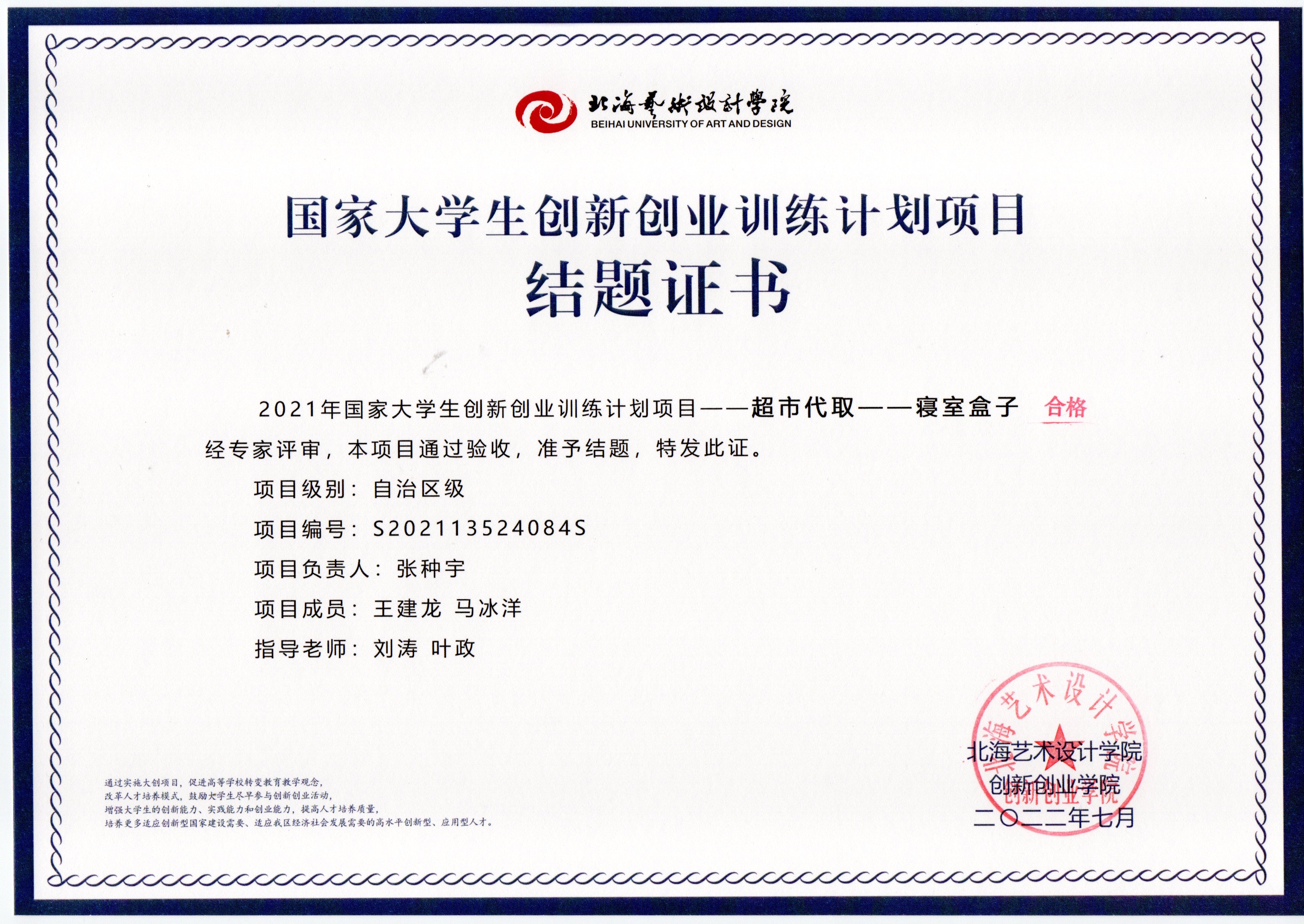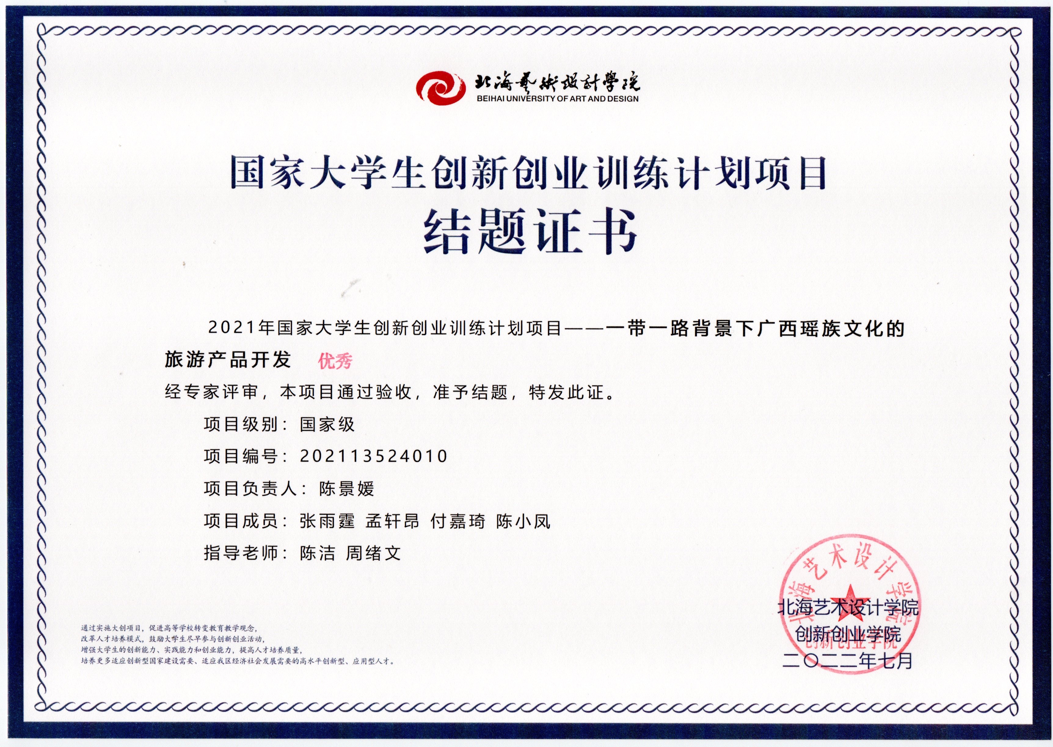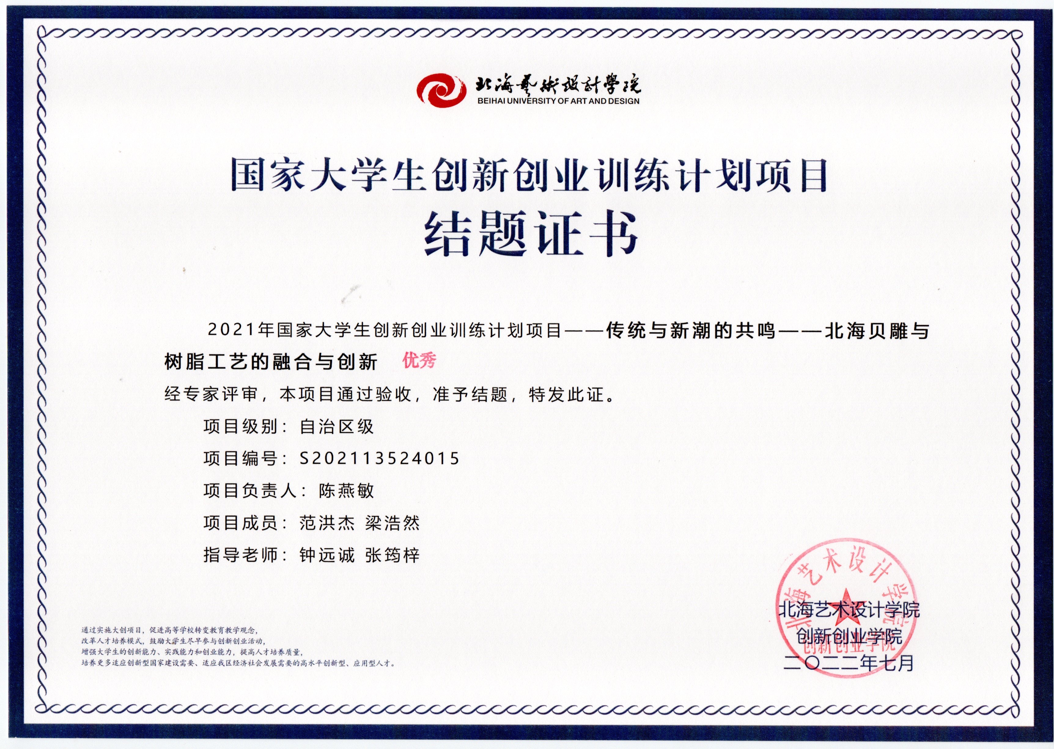 2022年大创项目结题证书(2021立项)