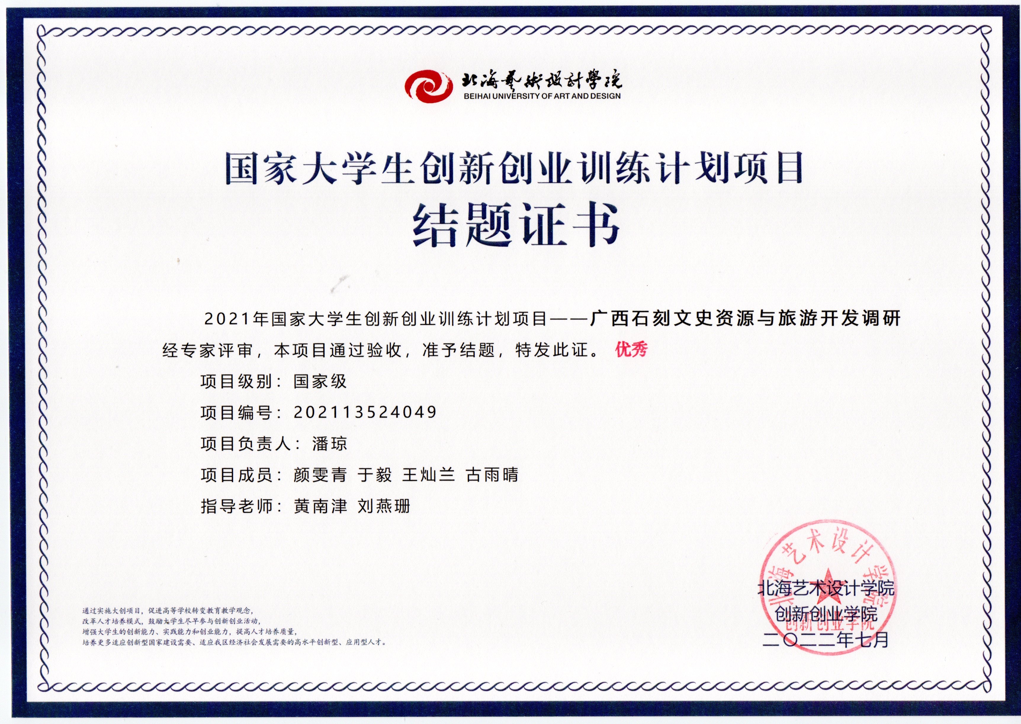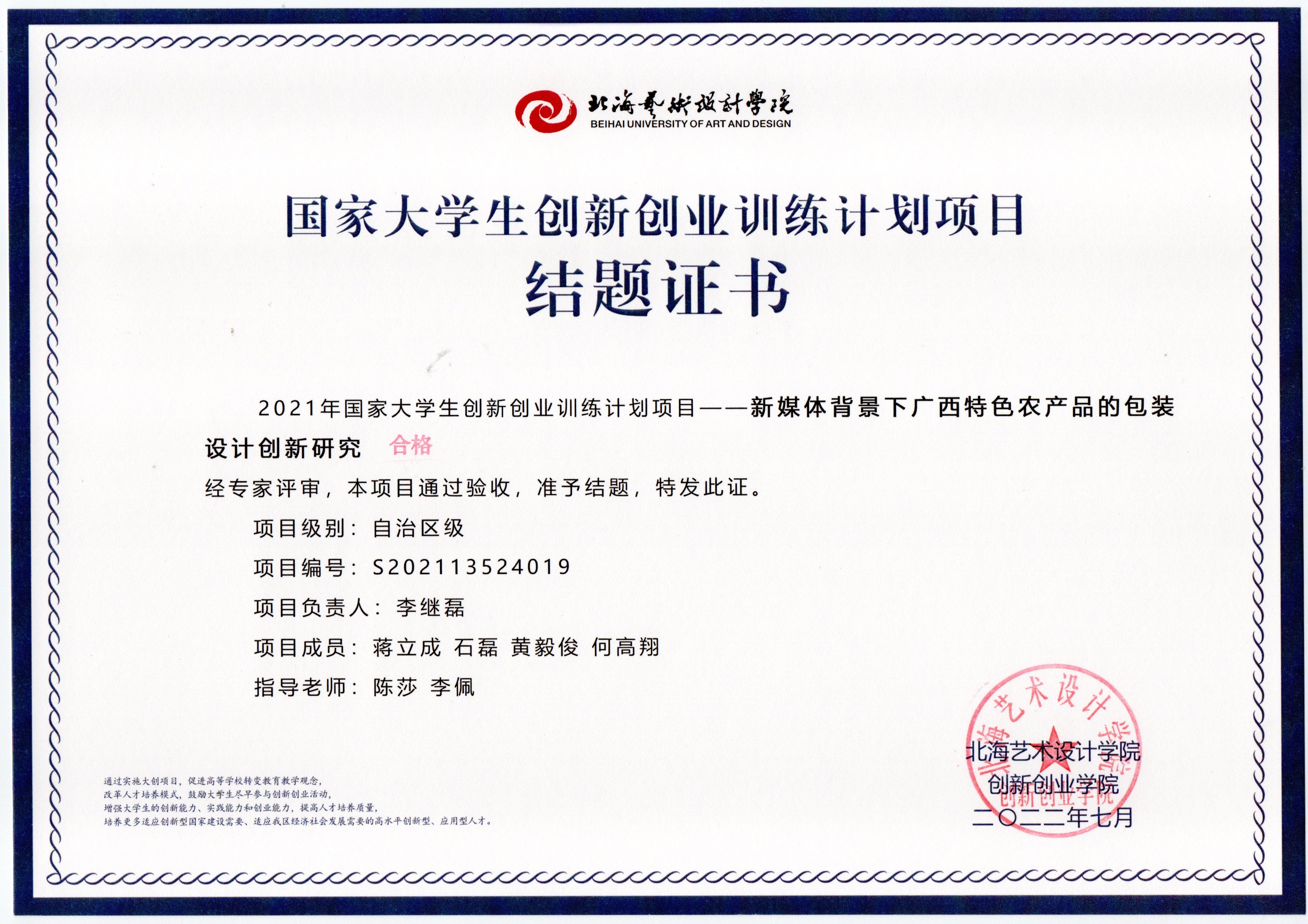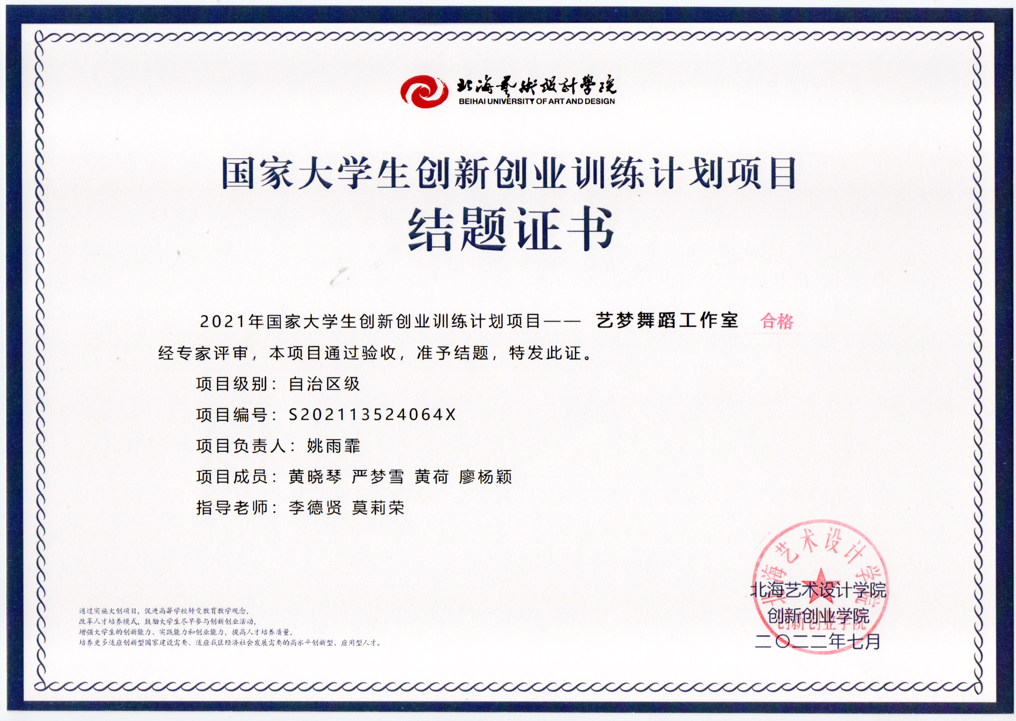 2022年大创项目结题证书(2021立项)