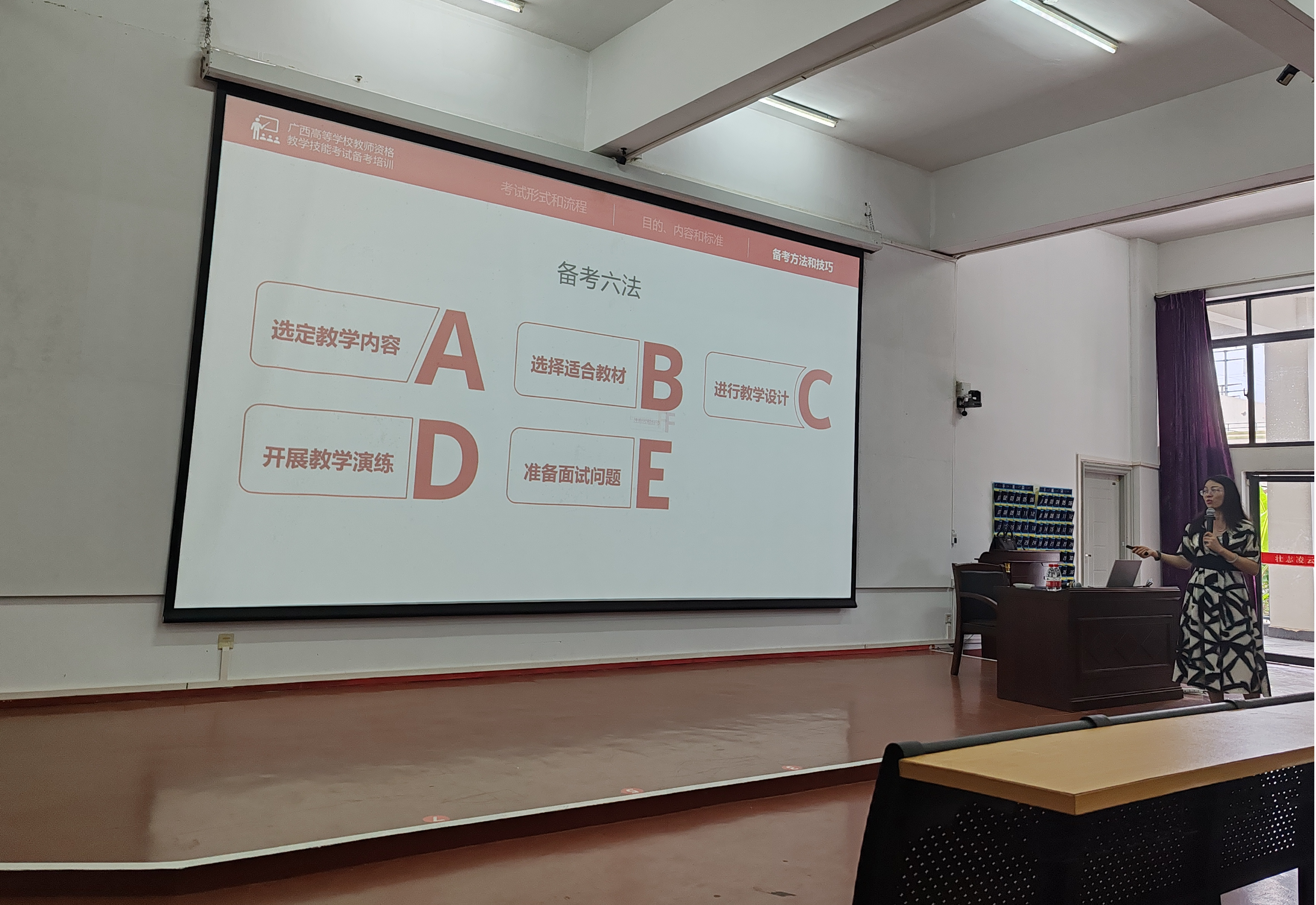 增强我校教师高校教师资格证技能考试应试技巧,提高高校教师资格证技能考试通过率,67下午人事处(教师发展中心邀请广西高等学校教师资格教学技能考试测试专家、FDW国际认证教学技能引导员左婧为我校今年参加高校教师资格证技能考试的教师开展了“高校教师资格证技能考试专题培训”本次培训地点设在西校区伦理楼107,由人事处处长屈志鑫主持,各学院/部门共90余位教师参加本次培训。