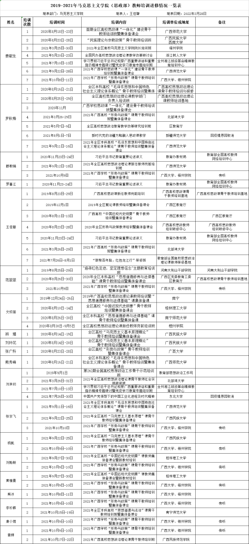 2019-2021年马克思主义学院教师培训进修情况一览表