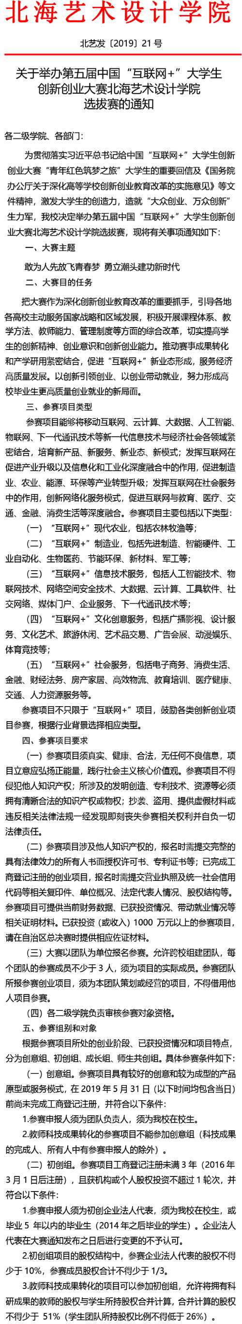 关于举办第五届中国“互联网+”大学生创新创业大赛北海艺术设计学院 选拔赛的通知