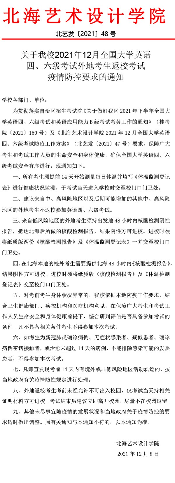 关于我校2021年12月全国大学英语四、六级考试外地考生返校考试 疫情防控要求的通知