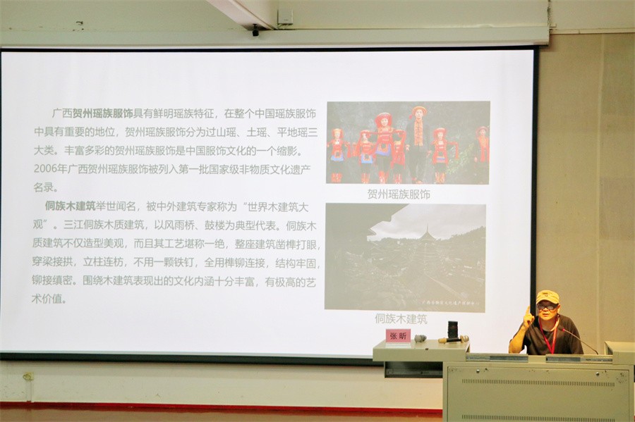 张昕教授通过展示中国区域历史文化分布图,以及中国非物质文化遗产的十大类别,说明中国是世界文化遗产最丰富的国家,这些丰富的传统文化资源,为现代设计提供了取之不尽用之不竭的设计资源。他还展现了广西的传统美术和传统技艺“非遗”名录,让广大师生进一步了解并学习各地富有特色的民族服饰文化,感受传统非遗文化深深地印上了民族的烙印。