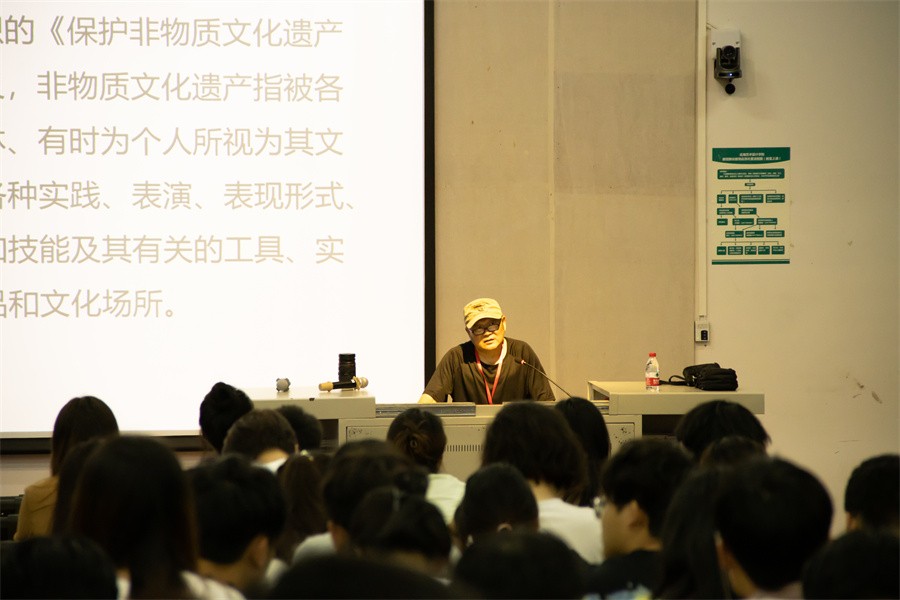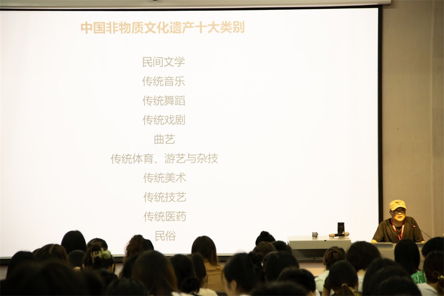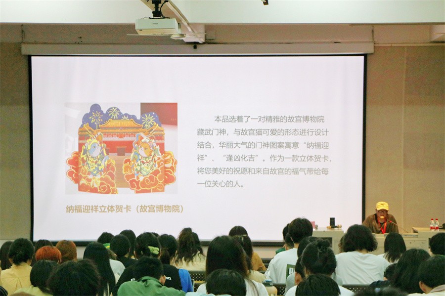此次讲座中,张昕教授以非遗衍生品设计、非遗衍生品设计原理以及途径、国风灿烂走向世界三个版块向在场师生进行具体讲授。