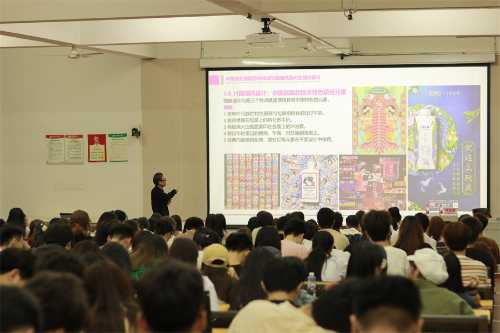 讲座伊始,范凯熹教授详细讲述了讲座课题的由来,并将其拆分为“何为国潮设计风”“何为中国文化基因符号”“如何通过AI生成式设计呈现”三个方面进行内容讲解。他阐述了国潮是将以中国传统文化基因为主进行的再创新、再发展,国潮流行的背后不仅是中国制造、中国品牌的崛起,更是中国情怀、中国自信的彰显,进而带领在场师生深入了解中国非物质文化遗产基因数据库的建设与特点。