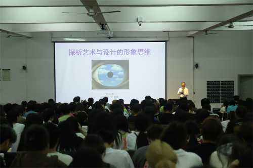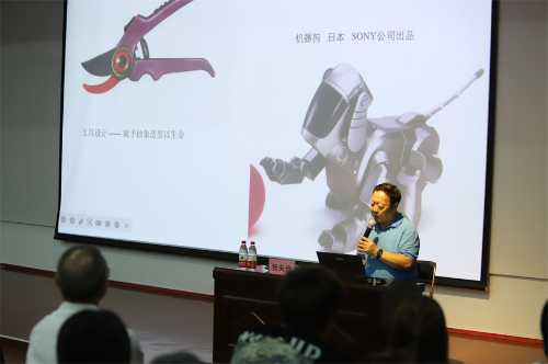 讲座开始,张夫也教授简单概述了艺术与设计的形象思维,强调了形象思维在设计中的重要地位,他通过评析油画《大家族》中的内容,向在场师生介绍作品里体现的形象思维,展示了一种强烈、另类的想象空间。张教授详细阐述了人类头脑对自然界的事物的高级反应和高级认知,讲解了智力与智慧的内在联系,进一步引出“智力是一种有结构的能力系统,想象是一种特殊形式的思维”的观点,向在场师生介绍思维的特点和分类:形象思维、抽象思维、灵感思维和创造性思维,并进一步解析其中的内在含义,张教授又通过一系列的国内外知名的设计作品与案例,生动形象地展示了每一个作品所体现的思维特点,令广大师生对思维有了更深刻的认识。