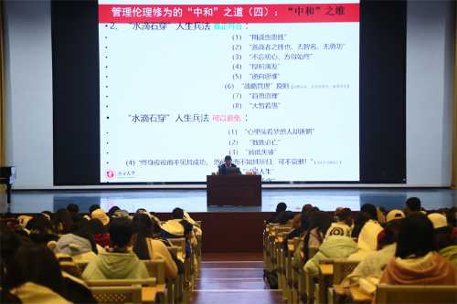 讲座伊始,王玉生教授指明了什么是哲学,他表示哲学贯彻于所有,对管理和伦理具有重要意义。讲座过程中,王玉生教授以中和”之象,“中和”之数,“中和”之理,“中和”之维四个部分脉络讲授了管理伦理修为的“中和”之道。