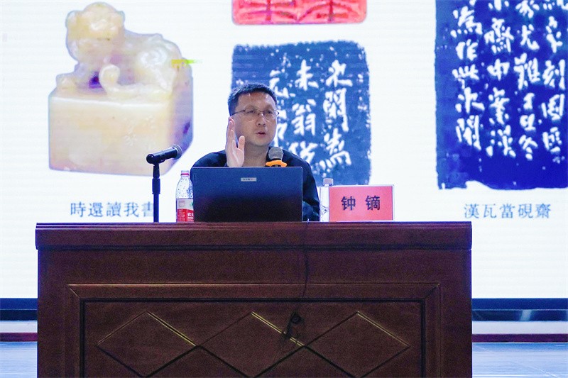 讲座伊始,钟镝教授以“方寸藏天地,刀笔写春秋”为切入点,并基于其数十年艺术实践与学术研究积淀,以通俗化表达梳理了篆刻艺术的起源与发展历程。他指出,作为中华优秀传统文化的重要载体,篆刻艺术与汉字演进、书法发展一脉相承,拥有数千年文明积淀。考古实证显示,商代已出现印章雏形,而陕西扶风出土的西周青铜印章,印证了该时期印章艺术已趋于成熟,修正“篆刻起源于秦汉”的传统认知,为篆刻史研究提供了关键实物佐证。
