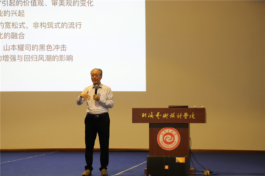 讲座临近尾声,李教授讲到,学习服装设计一定要对文化现象有所研究,努力创造出属于自己的文化,去影响未来的世界。李教授表示,北艺有着浓厚的艺术氛围,各个艺术专业之间可以融会贯通。他鼓励同学们敢于创新尝试,磨练艺术感觉,不断创作出更多优秀的作品。