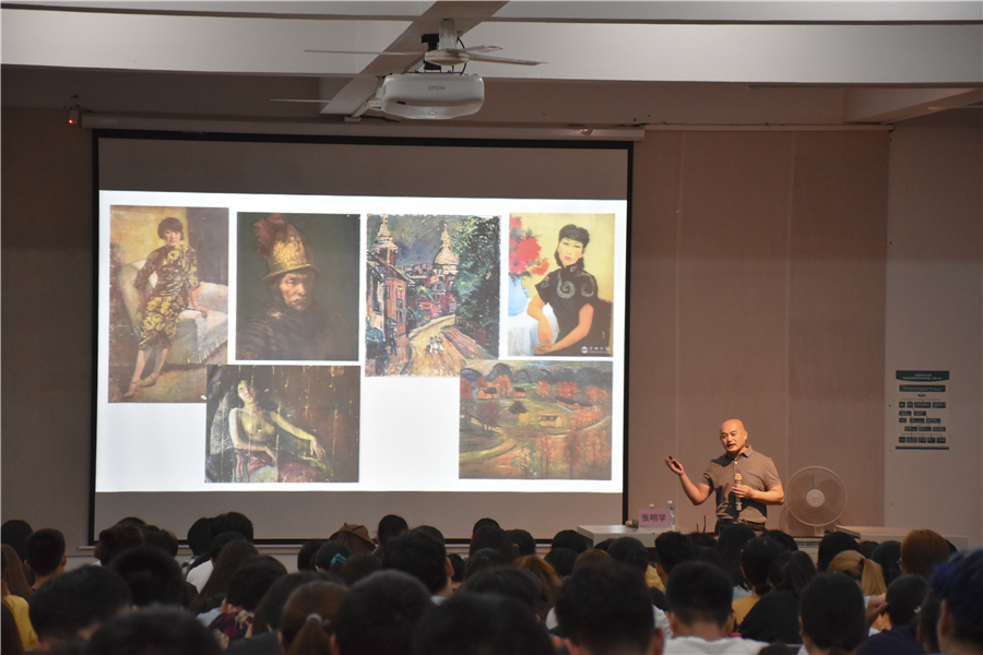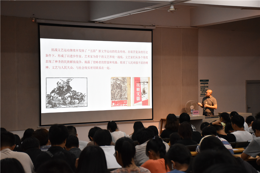 张教授讲述了抗战时期艺术事业的蓬勃发展情况,抗日战争不但没有遏制艺术的发展,反而促进了中国艺术事业的繁荣。随后,张教授详细讲述了抗战时期的中国文艺运动、抗战前的中国美术、抗战时期文化城美术运动、抗战时期美术作品蕴含的民族精神等四个方面。