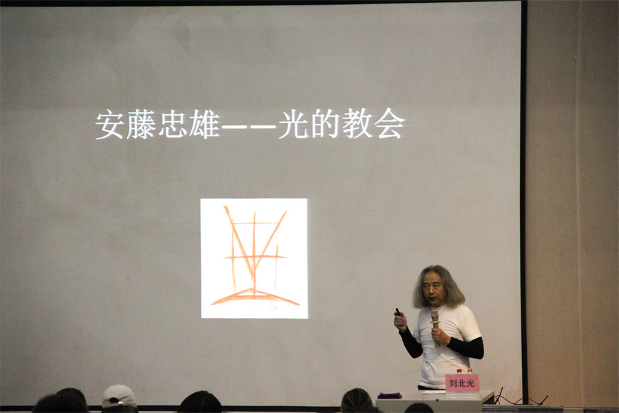 紧接着,刘北光教授通过举例方白美术馆利用方白“实”与“飘”结合的案例来说明功能不变是设计的底线,拓宽了同学们对环境艺术设计的思维。随后,刘北光教授列举了安藤忠雄--光的教会、安藤忠雄--本福寺水御堂的设计作品,告诉我们要针对项目提出问题且解决问题,并通过相关专业知识进行研究分析得出最后的成果。