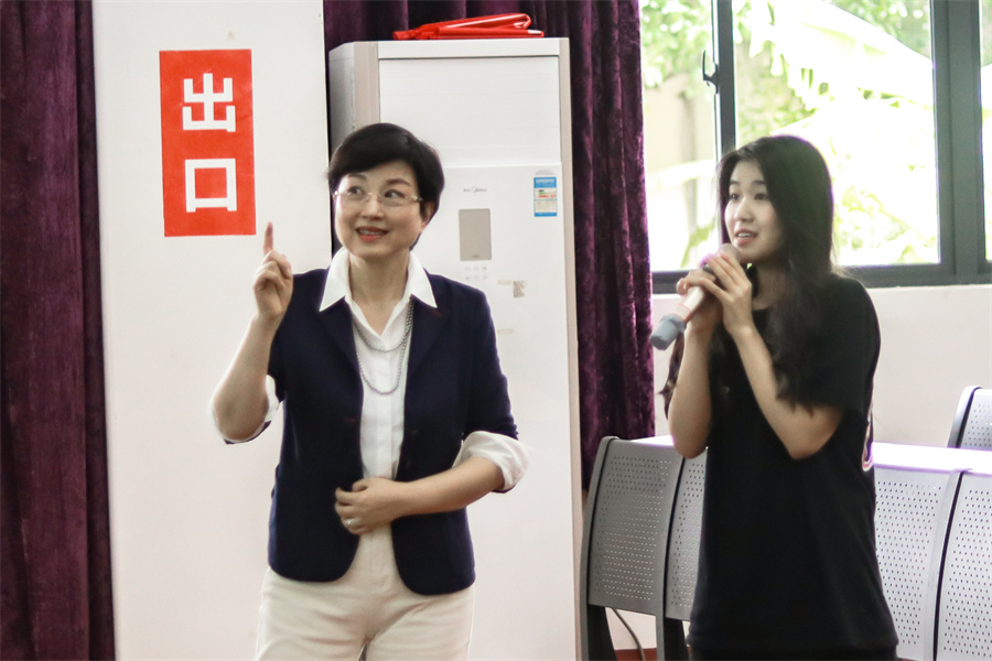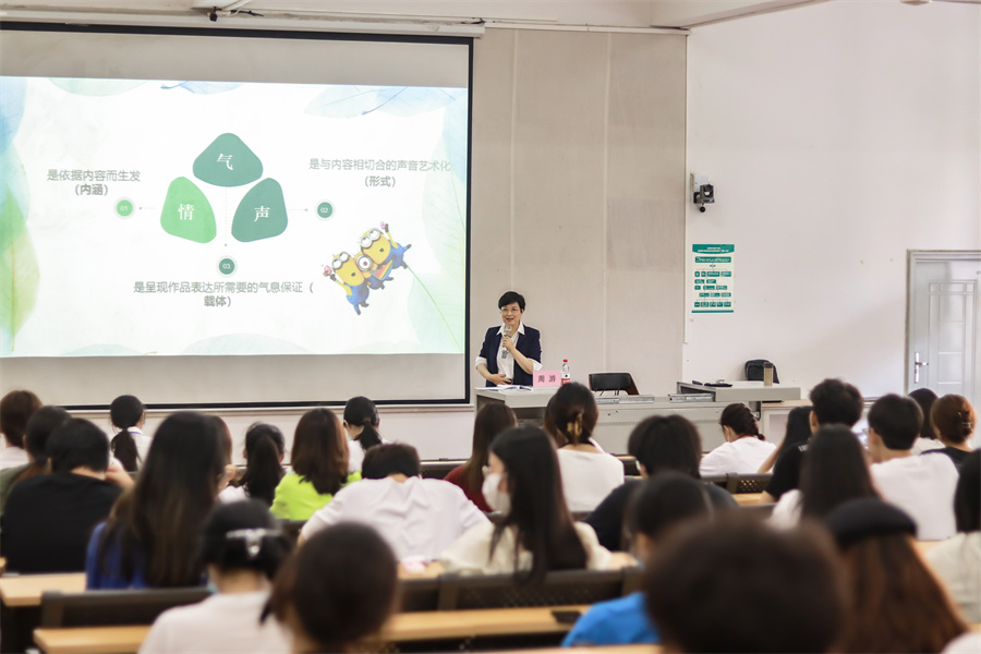 讲座一开始,周游教授以自身的经历为切入点,阐述了声音名片的重要性并提出了“语言工作者的声音就是她的名片”的重要观点,她指出朗诵中情、声、气的正确运用对“声音名片”的打造具有重要意义。