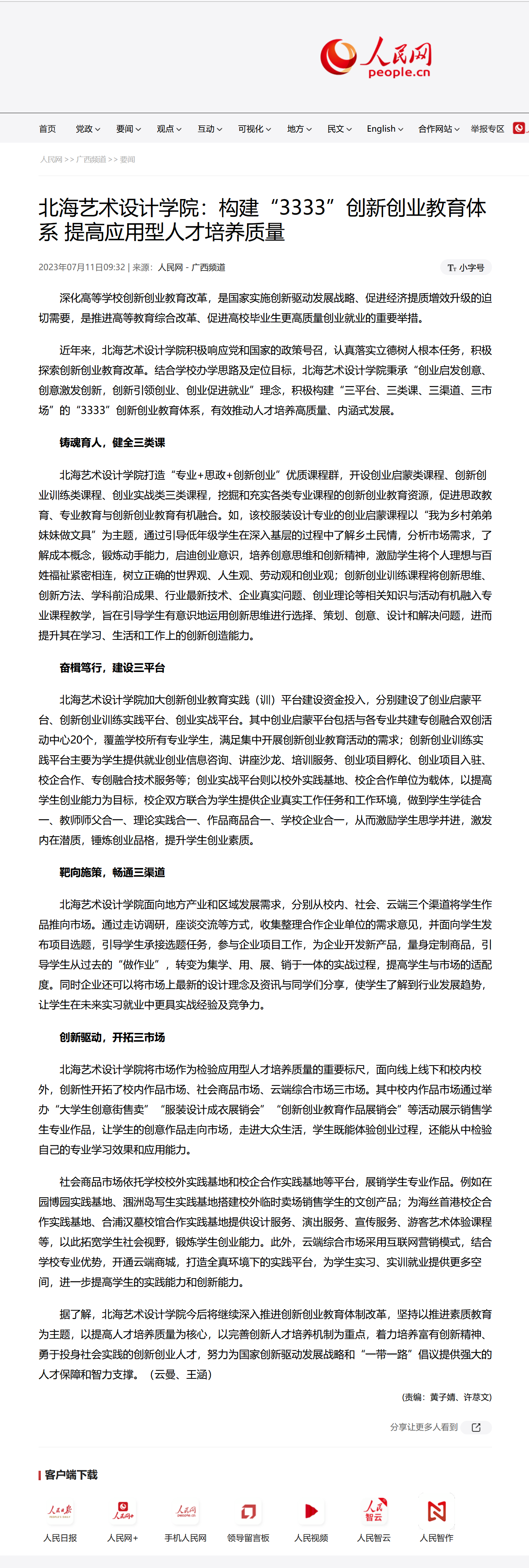人民网:北海艺术设计学院:构建“3333”创新创业教育体系 提高应用型人才培养质量
