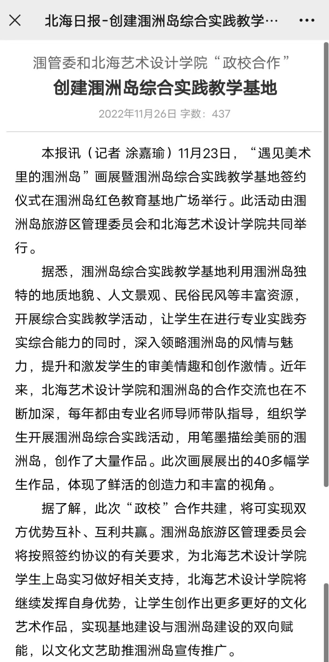 北海日报:涠管委和北海艺术设计学院“政校合作” 创建涠洲岛综合实践教学基地