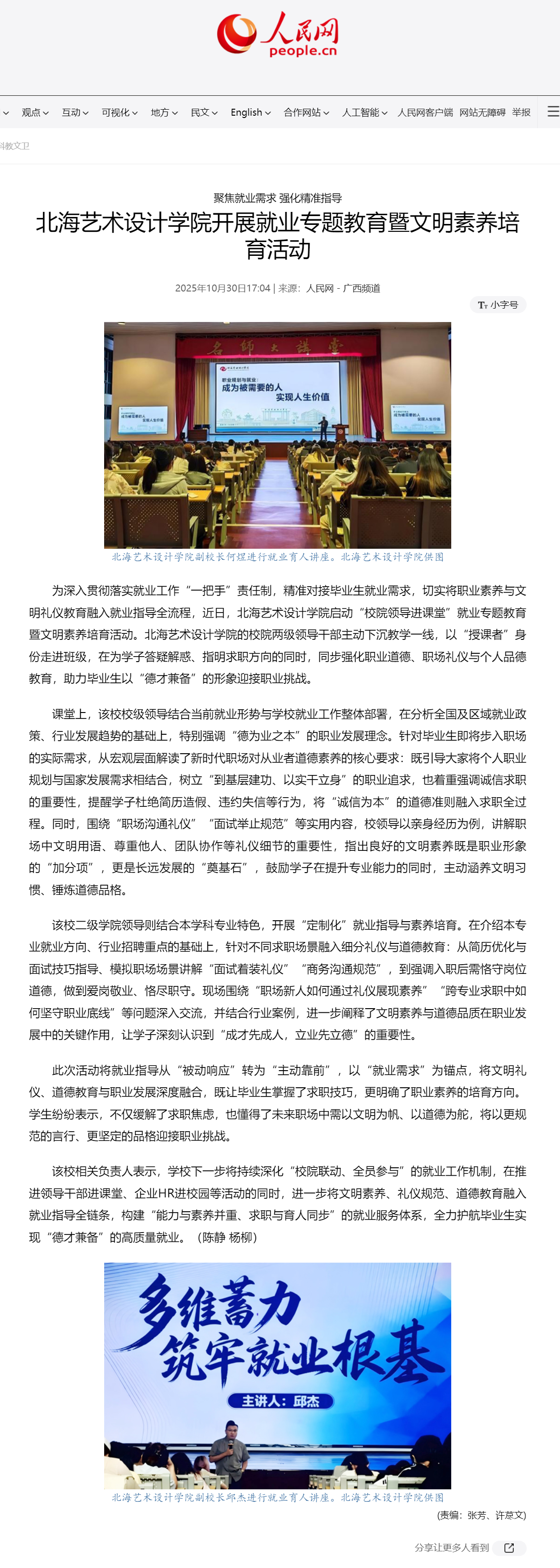 人民网:聚焦就业需求 强化精准指导——北海艺术设计学院开展就业专题教育暨文明素养培育活动