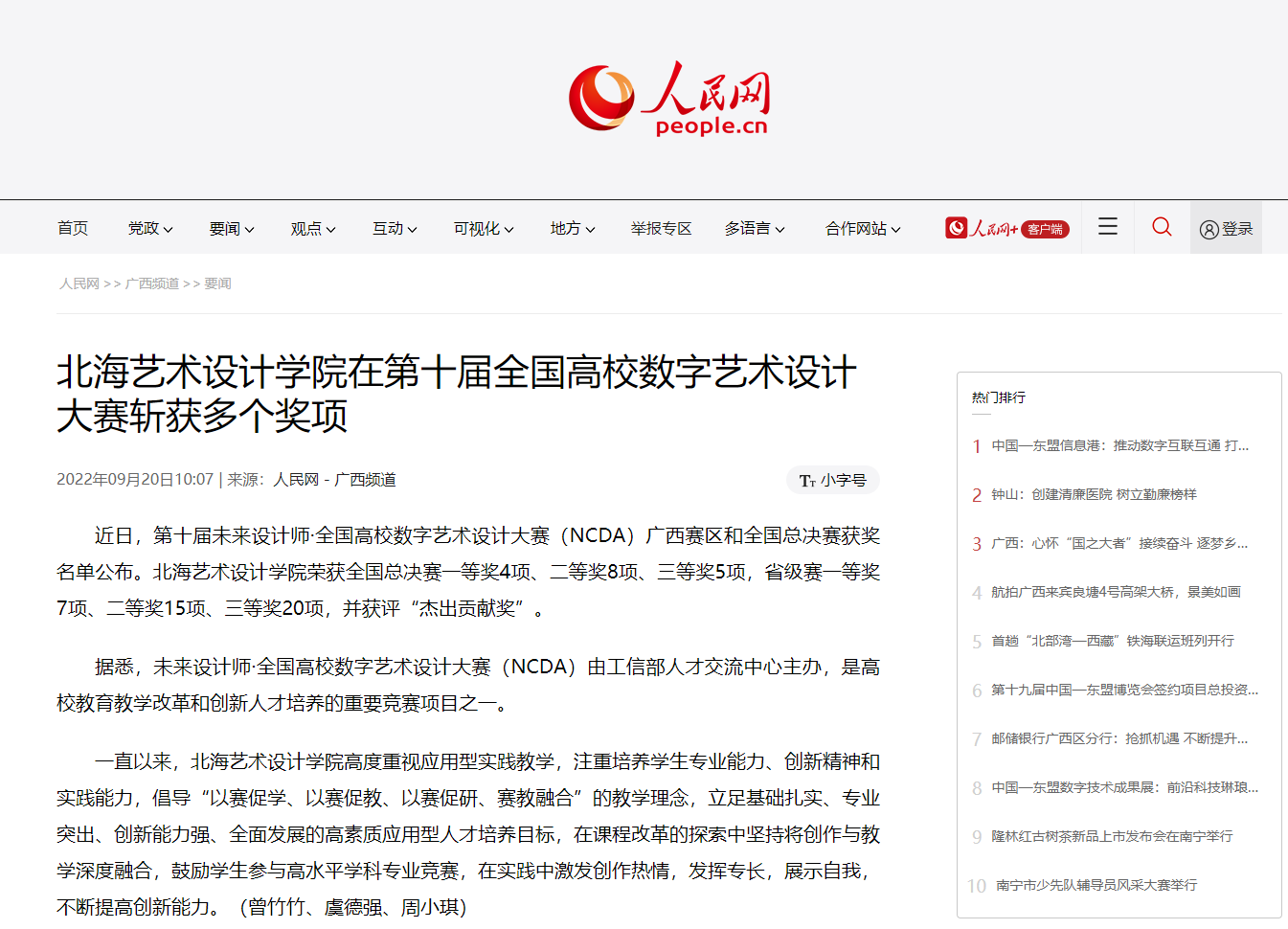 人民网:北海艺术设计学院在第十届全国高校数字艺术设计大赛斩获多个奖项
