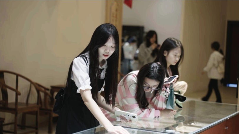 (学生们参观非遗艺术品