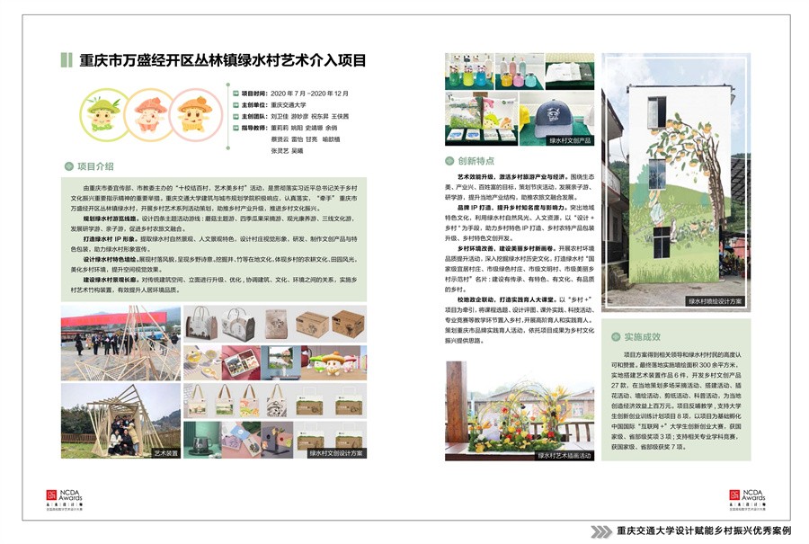 为贯彻落实乡村振兴战略,发挥学科竞赛“立德树人”功能,推动高校设计创新力量赋能乡村振兴,未来设计师·全国高校数字艺术设计大赛(NCDA)组委会与民政部直管智惠乡村志愿服务中心联合发起“我为乡村做设计”志愿服务活动,开展包含乡村设计学学术研究、乡村振兴设计竞赛、设计赋能乡村振兴案例征集、乡村振兴领域志愿服务等一系列活动内容,引导高校师生弘扬传统美德,传承红色文化,宣传乡村文旅,助力乡村振兴。活动得到工信部人才交流中心等单位的指导和支持,高校师生们的积极参与。