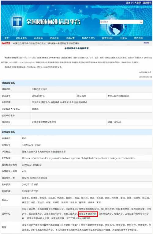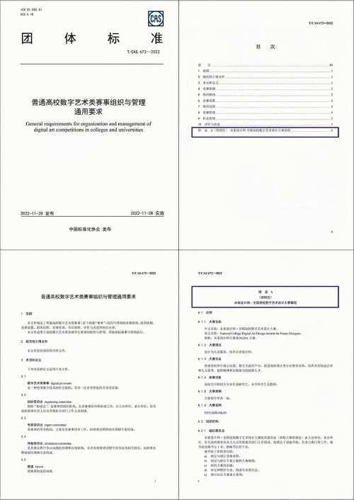 近日,由未来设计师·全国高校数字艺术设计大赛(以下简称为未来设计师NCDA大赛)组委会和中国计量大学联合发起,中国美术学院、华东师范大学、江南大学、重庆交通大学、北海艺术设计学院等14所高校参与研制的《普通高校数字艺术类赛事组织与管理通用要求》(标准号T/CAS672—2022)正式由中国标准化协会(CAS)发布。