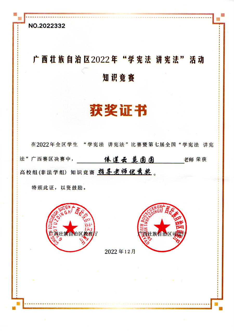 在此次赛事中,我校人文教育学院汉语言文学专业2104班朱梦茹同学荣获高校组(非法学组)知识竞赛优秀奖;俸莲云、莫圆圆老师在“学宪法,讲宪法”活动知识竞赛中荣获高校组(非法学组)知识竞赛指导老师优秀奖。