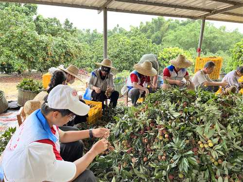 (志愿者帮助农户采摘荔枝)