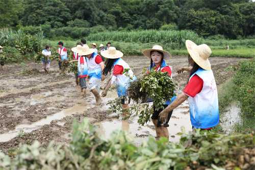 (志愿者帮助农户抢收花生)