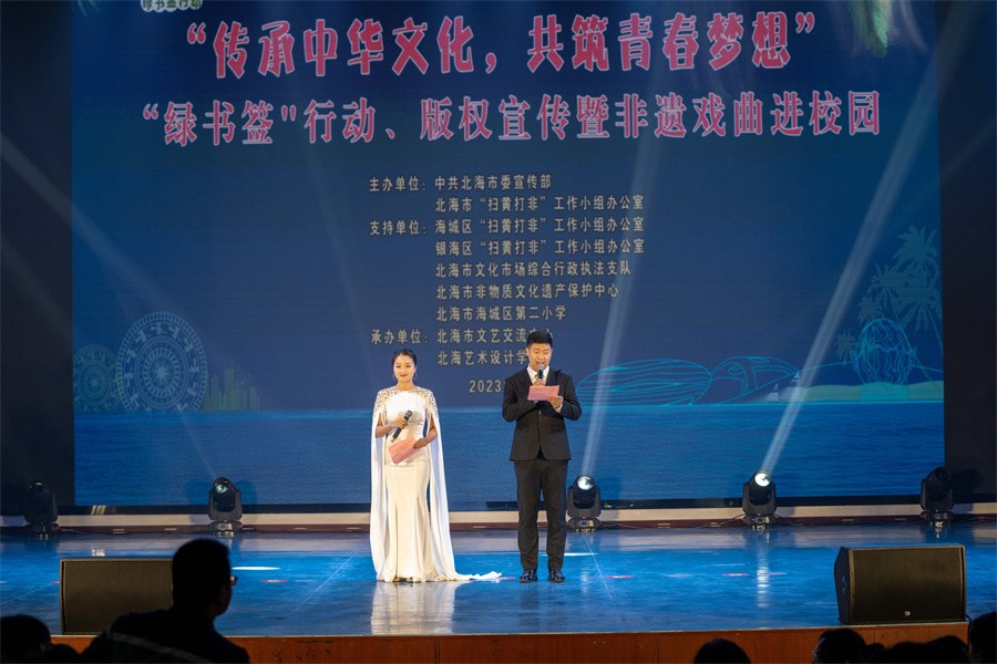 11月6日晚,以“传承中华文化 共筑青春梦想”为主题的2023年“绿书签”行动、版权宣传暨非遗戏曲进校园文艺汇演活动在北海艺术设计学院举办。