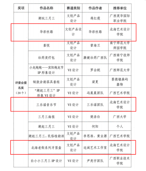 近日,由自治区党委宣传部、自治区教育厅、自治区文化和旅游厅联合举办的2024“潮起三月三”创意设计大赛公布了获奖名单,我校报送的《华彩丝路》《三乐谣音乐节》《北海老街系列牙签盒》3项作品荣获评委会提名奖,学校荣获优秀组织奖。