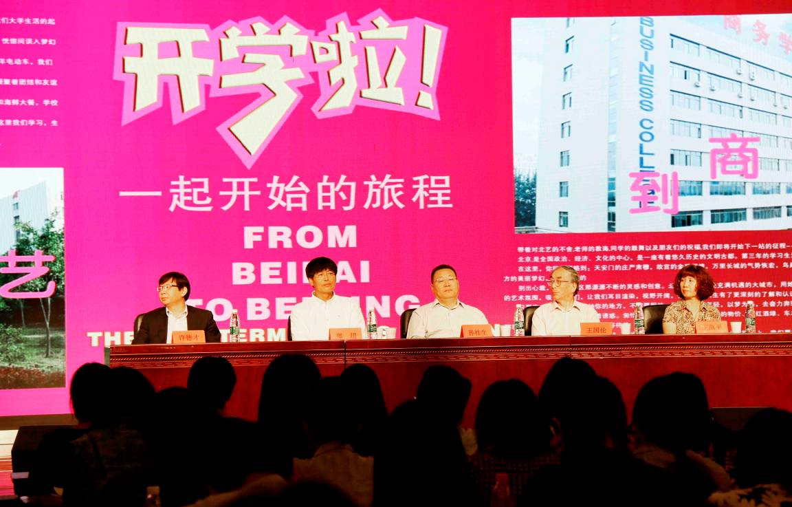 时维九月,序属三秋,大地流金,万物呼晴。在这个秋色宜人的季节里,一批怀揣梦想的北艺学子又踏上了北京的求学之路。2015年9月13日上午9点,我院2013级环艺、视觉全体同学在北京联合大学商务学院隆重举行了开学典礼。商务学院副院长孙桂生,北海艺术设计学院院长王国伦等院级领导出席了本次开学典礼。