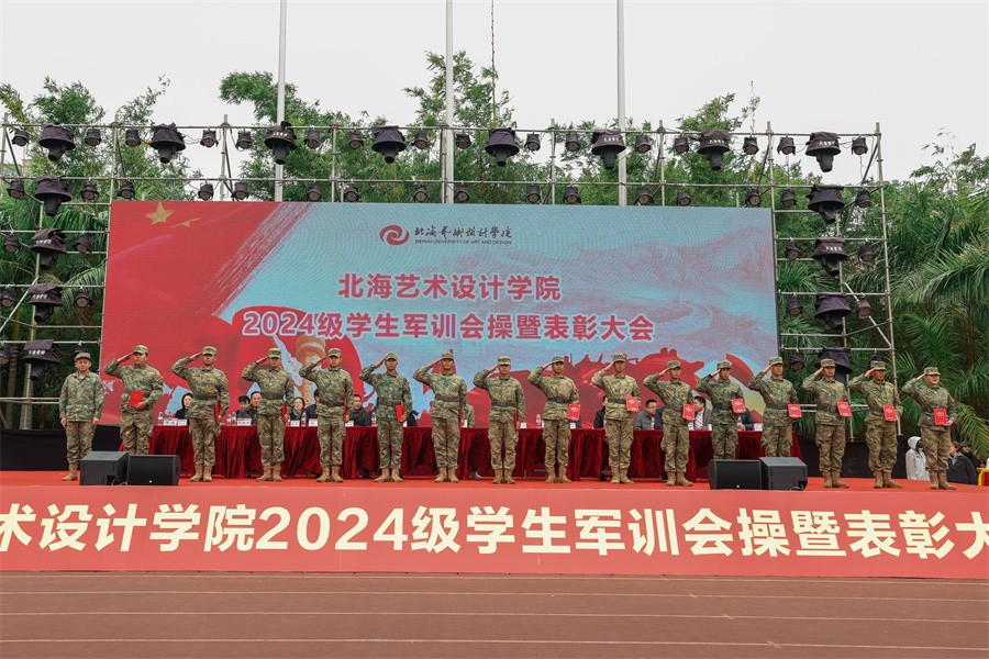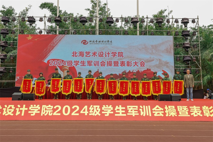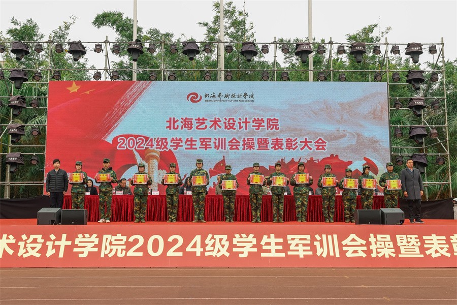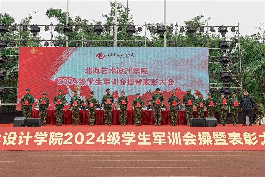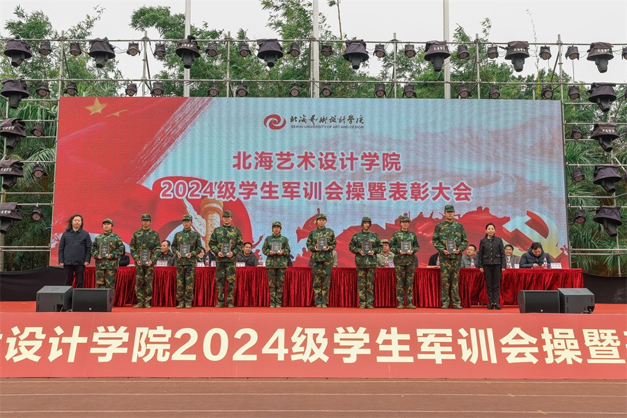 大会上,党委副书记陈毅华宣读了《北海艺术设计学院关于表彰2024级学生军训“优秀标兵”“优秀内务寝室”“优秀教官”“优秀连队”的决定》,向军训中的优秀个人、先进集体和在军训期间合唱比赛中获奖的连队进行表彰,并由现场领导依次颁发荣誉证书和锦旗。(李伟民 王金凤 何汝鑫 范佳涵 潘炜城 周小琪/摄)