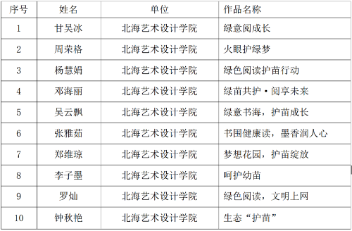近日,北海市委宣传部公布了北海市2025年“绿书签行动”海报设计作品征集活动入围名单,我校师生共计10人入围。