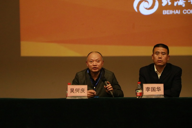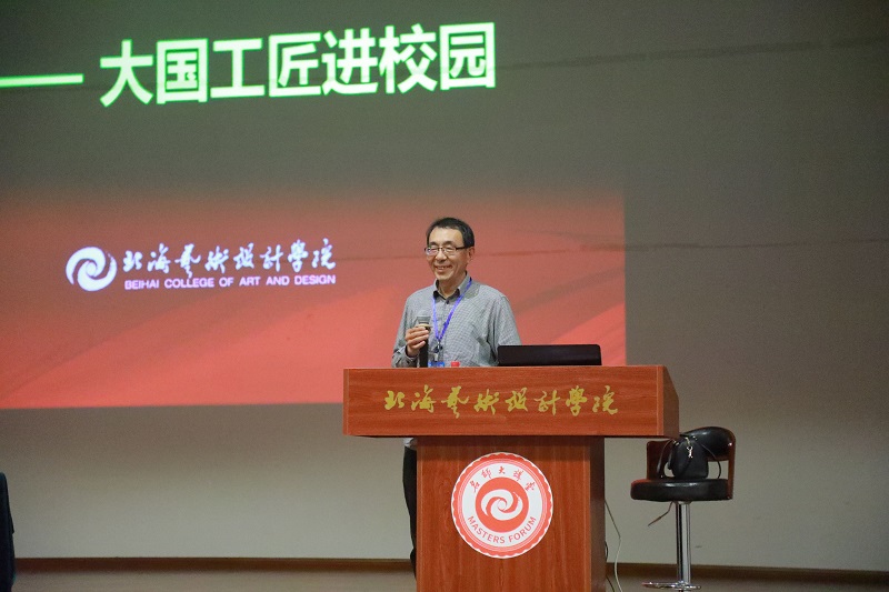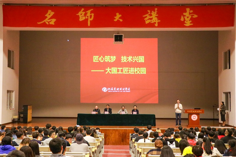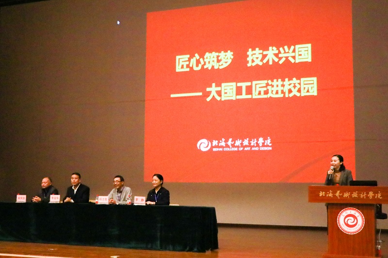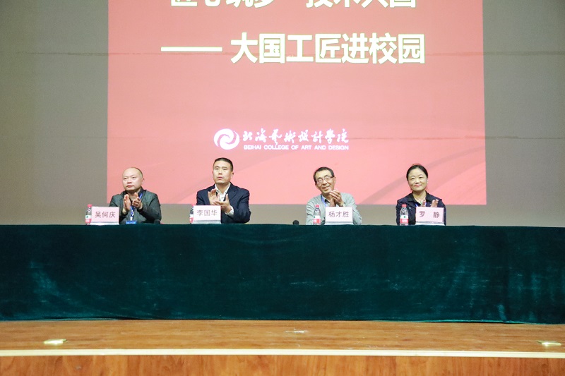 为了更好的培育学生精益求精的工匠精神,2017年12月7日晚上7:30, 由北海艺术设计学院和北海市人社局共同举办的“大国工匠进校园”活动在学院大礼堂举行。本次活动邀请了杨才胜大师、李国华大师、罗静大师、吴何庆大师。活动由学院宣传部部长、团委副书记文春明主持。