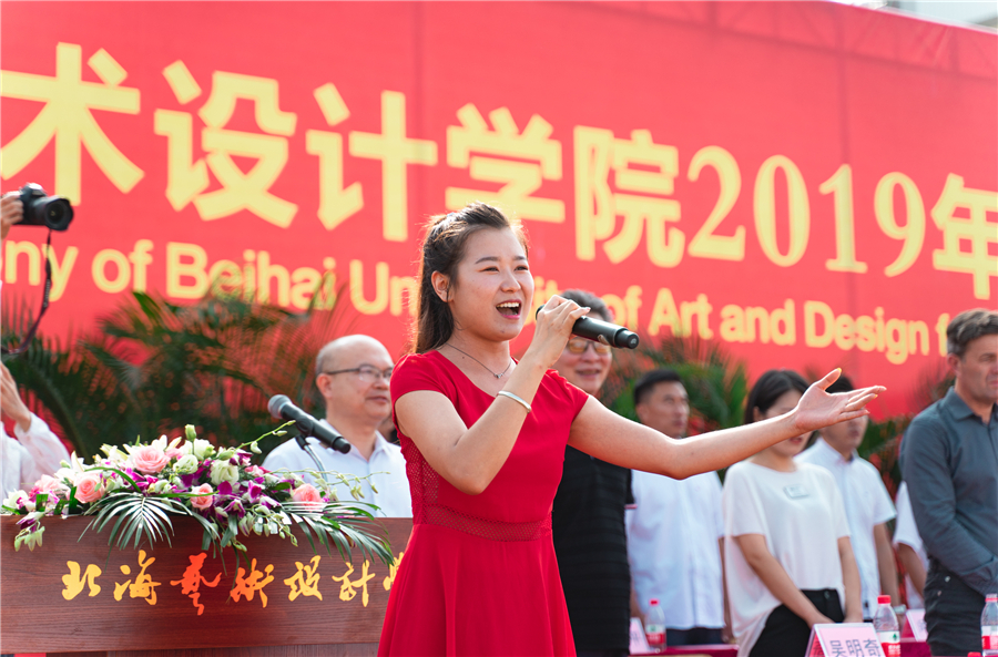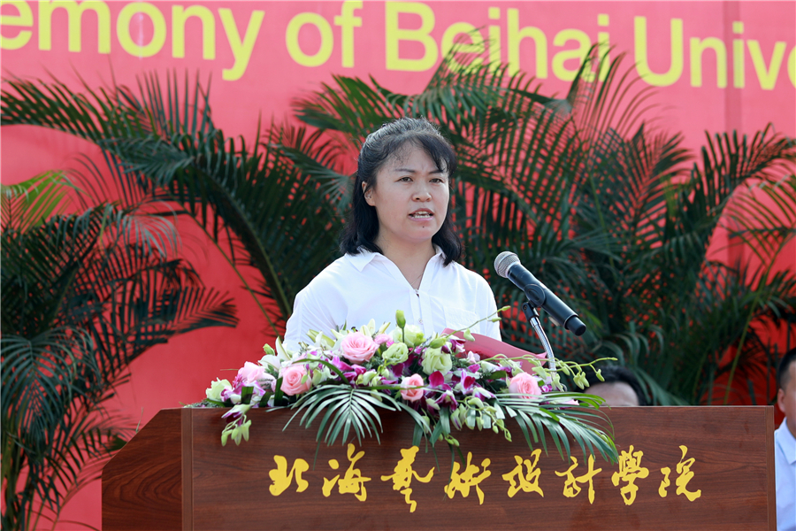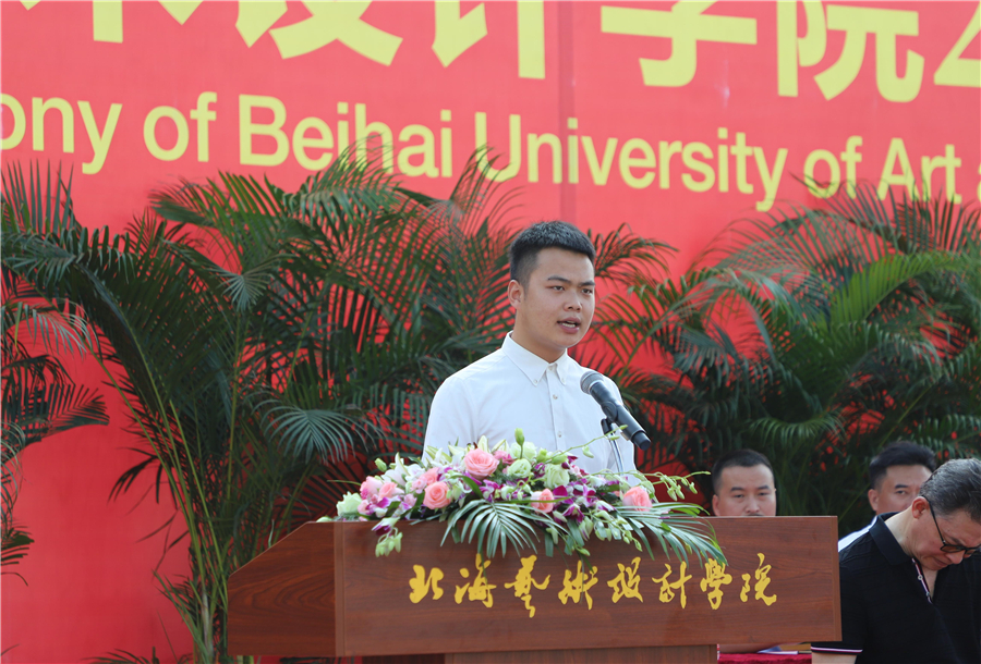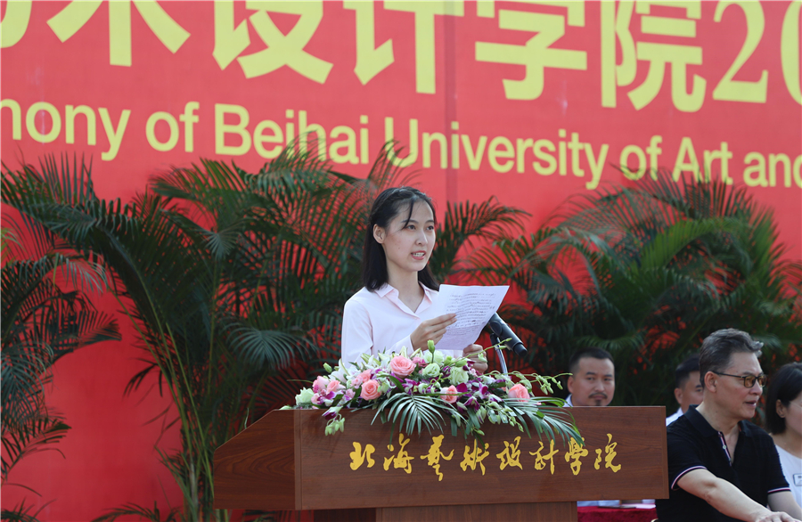 2019级新生代表于涵同学发言,她代表全体新生向过去12年求学路上家长和老师的陪伴和教诲表示感谢!她说,我相信,北海艺术设计学院有足够大的舞台助力我和我的同学们实现梦想!作为新时代青年,我们将不负习近平总书记的殷切希望,勤奋读书,勇于实践,“扣好人生第一粒扣子”,勇担时代重任,自觉把个人奋斗融入到学校的发展之中,在新时代里放飞青春梦想。