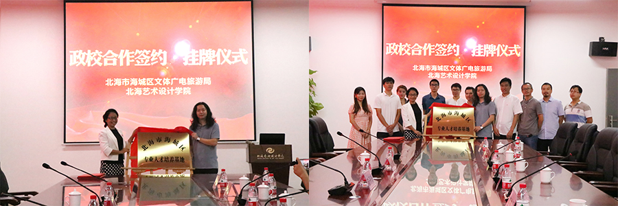 我校副校长胡胜与北海海城区文体广电旅游局局长陈丹玲共同签署了合作协议,这标志着双方在人才互补、实践实习、定向培养、互动交流、从业培训、课题研究、文创产品开发等方面建立起长期的合作关系。