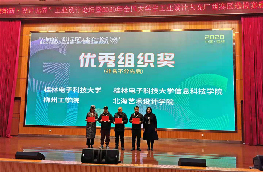 2020年12月19日,由广西自治区教育厅、桂林电子科技大学共同主办的“万物始新·设计无界”工业设计论坛暨全国大学生工业设计大赛(广西赛区)选拔赛颁奖典礼在桂林电子科技大学花江校区举行。桂林市政府相关领导以及全区各高校领导、师生代表参加了颁奖典礼。