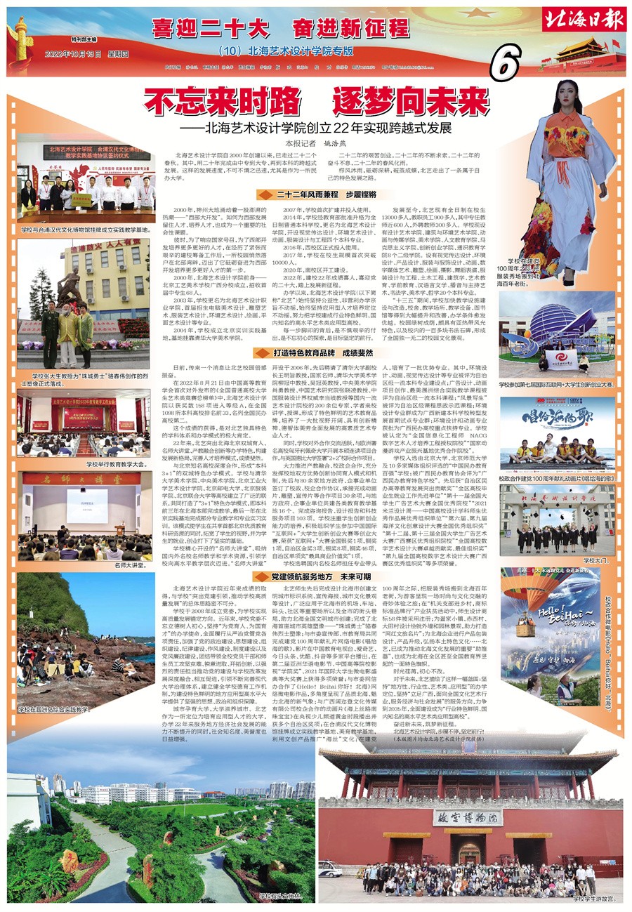 今天,北海日报以“不忘来时路 逐梦向未来——北海艺术设计学院创立22年实现跨越式发展”为题推出关于我校办学成就的专版报道,展示北海艺术设计学院砥砺深耕培育人才,百舸争流破茧成蝶的特色发展之路。