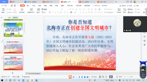 目前,北海市正在开展第七届(2021-2023年)全国文明城市创建活动。要求各学生了解参与和支持文明城市创建活动,做到言行文明,美化城市环境,优化城市秩序,促进人际关系和谐。积极为城市发展和创城工作建言献策。文明是一座城市的内在气质,也是一座城市的幸福底色。我们每一个人,即是创建成果的受益者,更是创建工作的主力军。